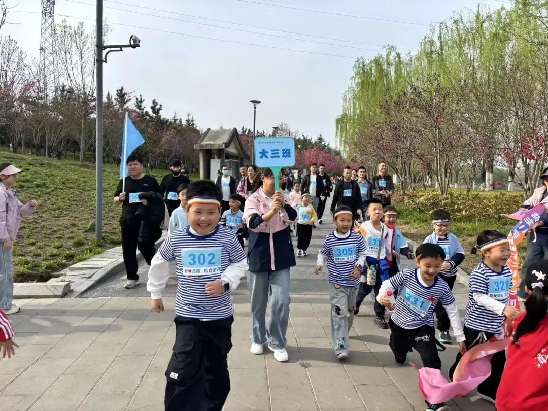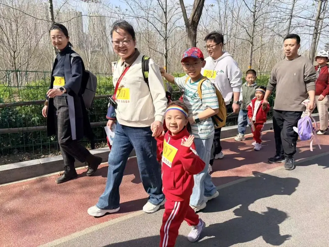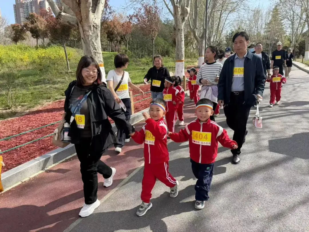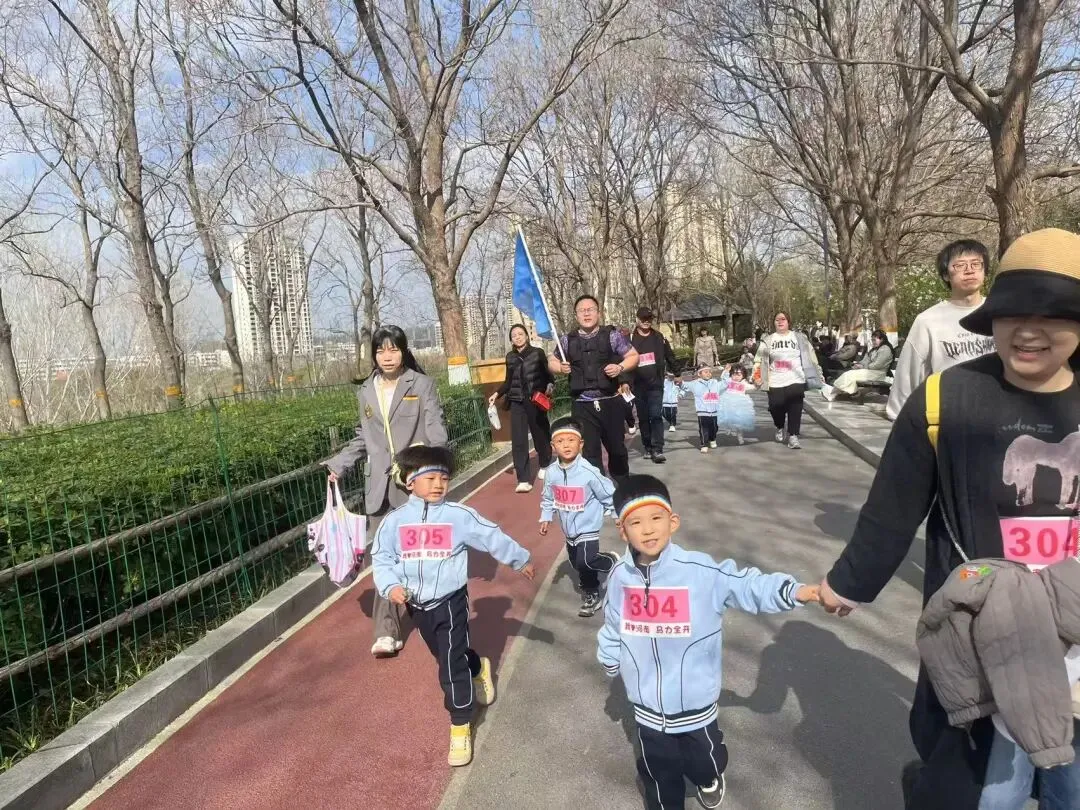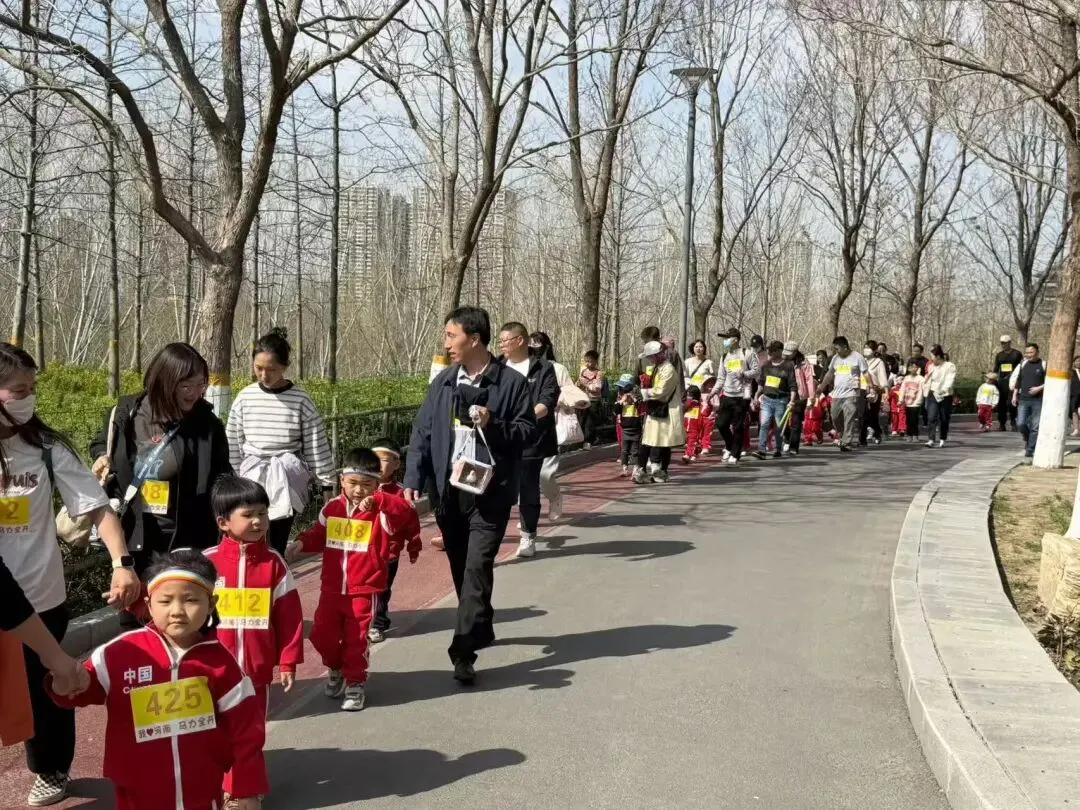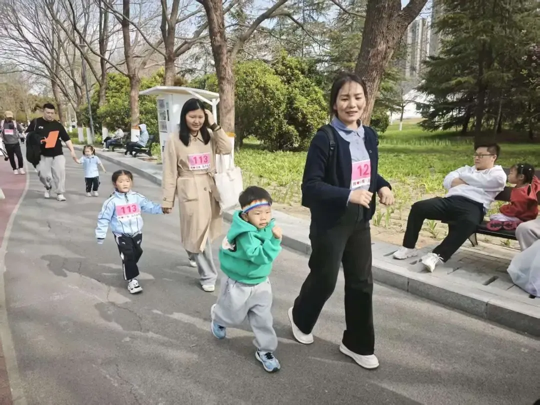 “出发!”随着张园长一声清脆指令,亲子队伍有序启程,向着终点坚定前行。孩子们的小小身影穿梭在西流湖公园的五彩春色中,与身旁陪伴的家长相映成趣,构成一幅满是活力与温情的动人画卷。