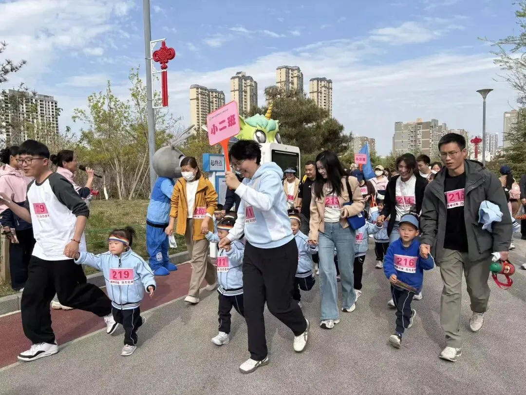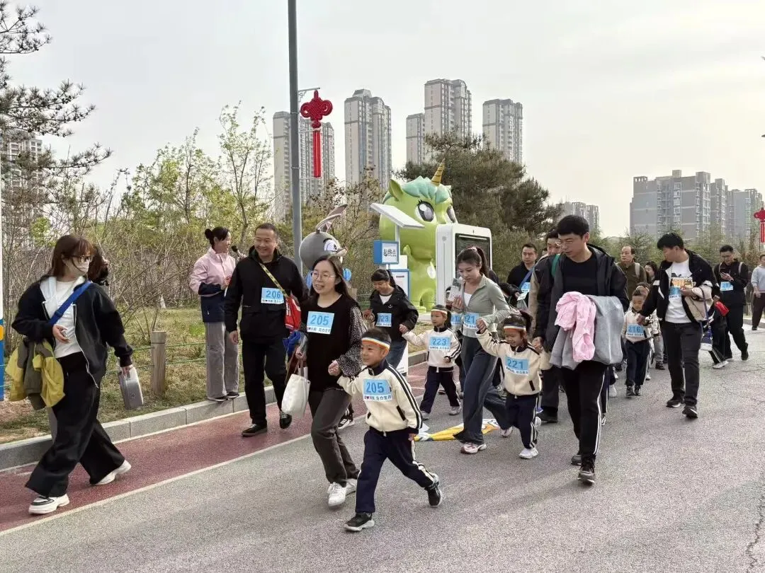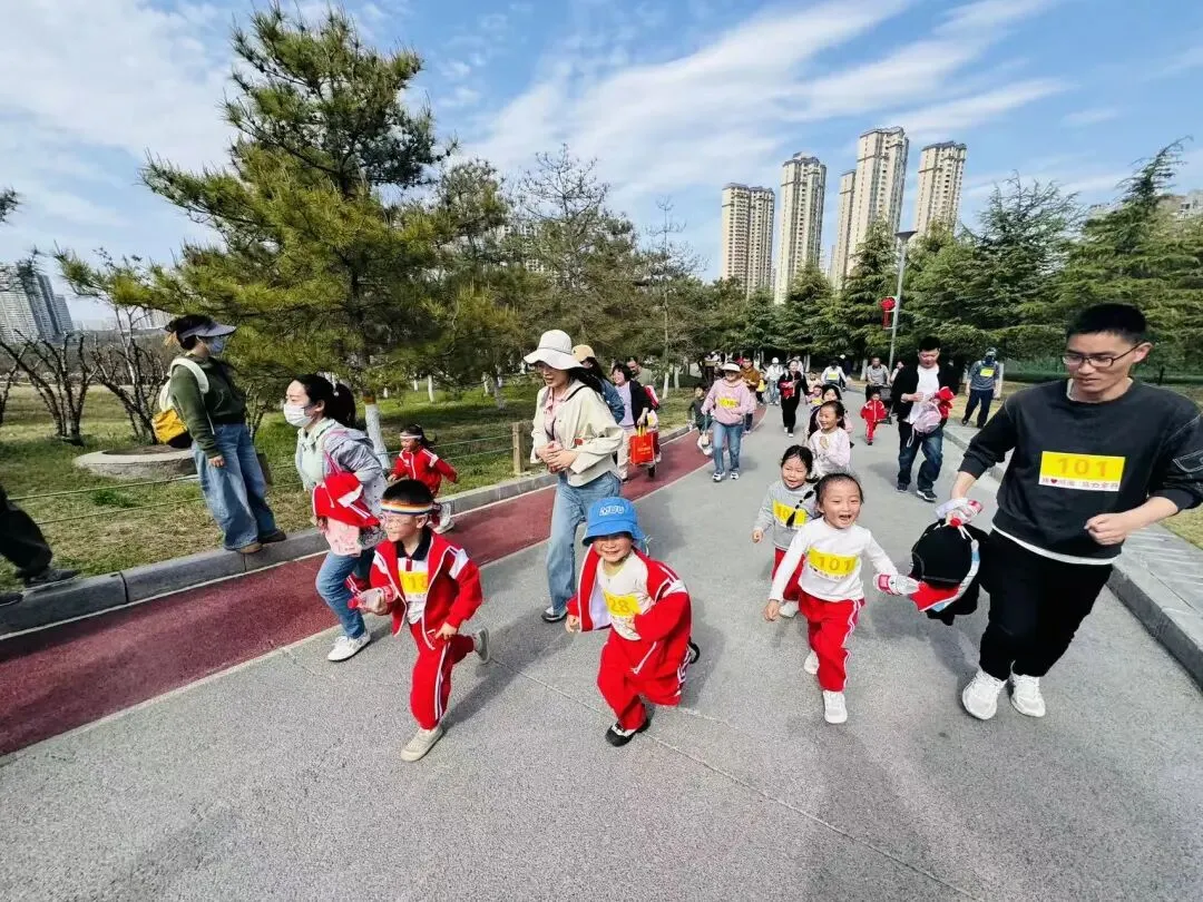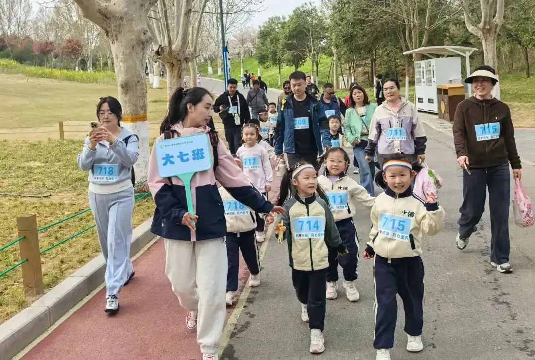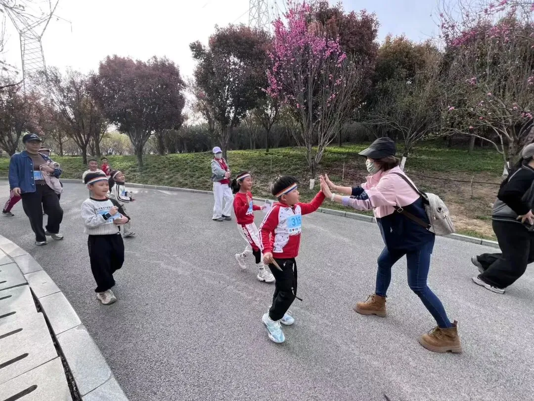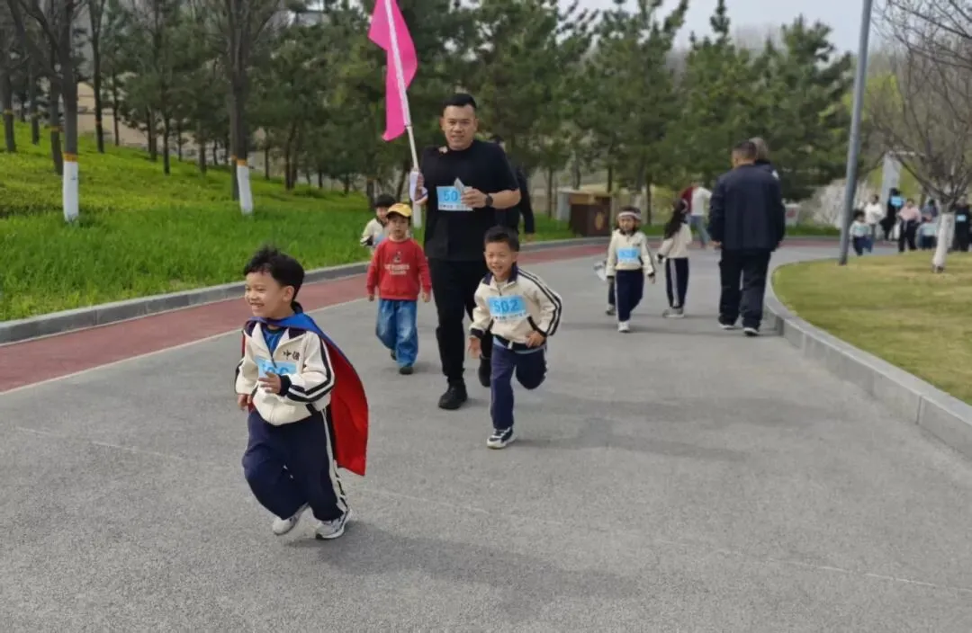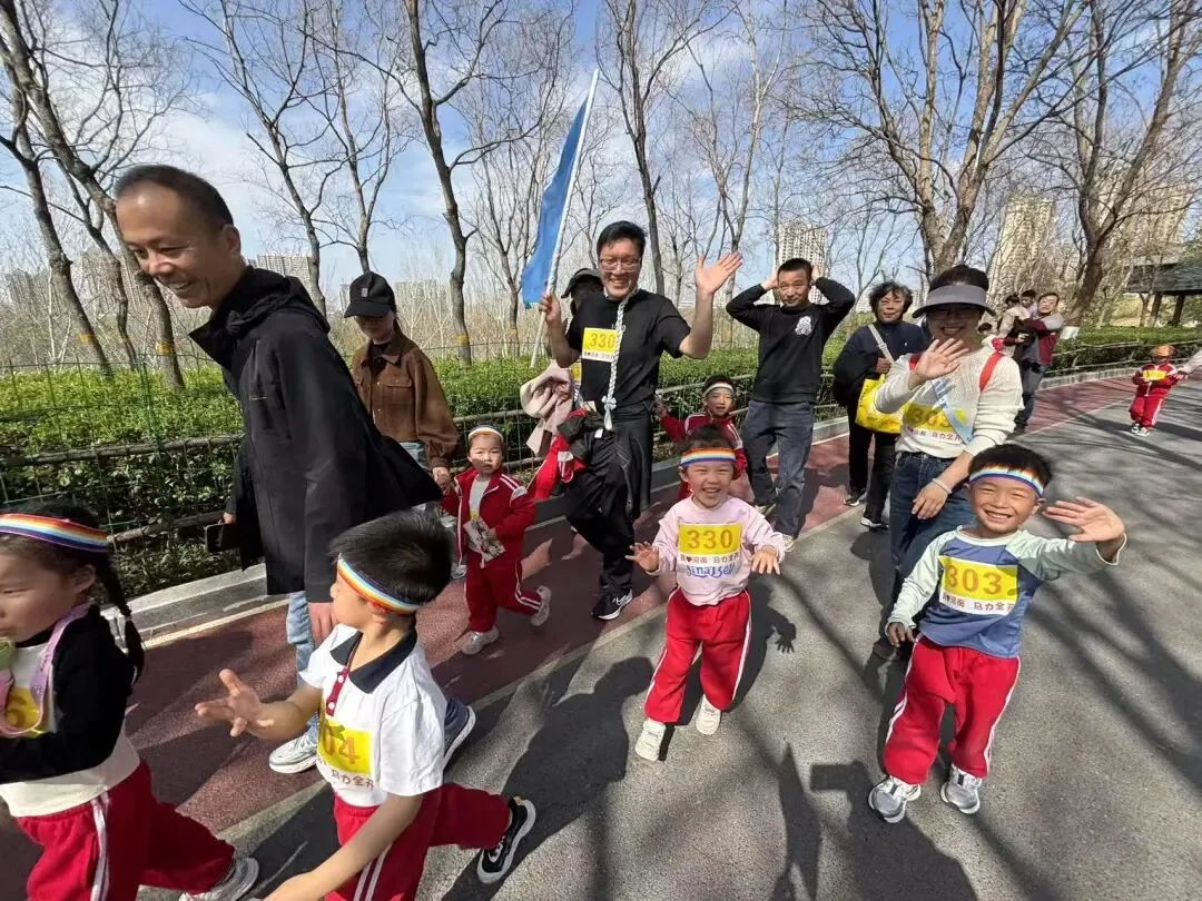 “出发!”随着张园长一声清脆指令,亲子队伍有序启程,向着终点坚定前行。孩子们的小小身影穿梭在西流湖公园的五彩春色中,与身旁陪伴的家长相映成趣,构成一幅满是活力与温情的动人画卷。