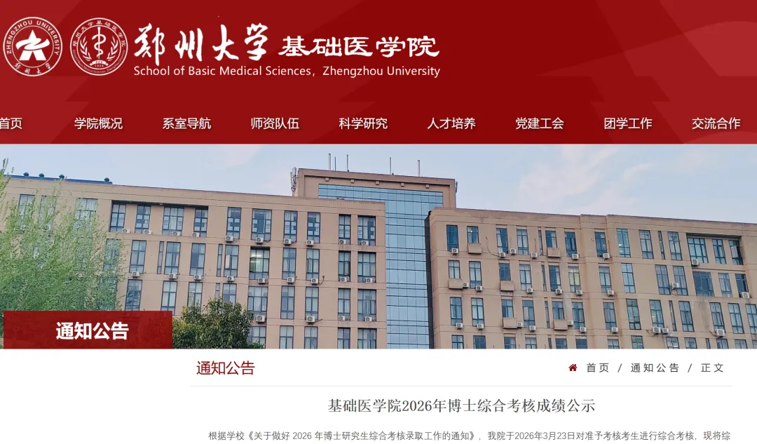郑州大学基础医学院2026年博士综合考核成绩公示!