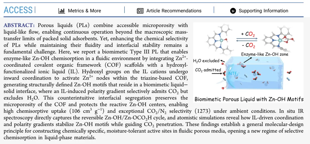 大气CO₂浓度的持续攀升使高效碳捕集技术的开发愈发迫切。液胺洗涤作为工业主流方案,因再生能耗高、溶剂降解及腐蚀问题而制约其经济可行性。以沸石、金属有机框架(MOFs)和共价有机框架(COFs)为代表的纳米多孔固体吸附剂,兼具高比表面积、精确孔环境与可调活性位点,在气体储存与分离领域展现出强劲潜力。然而,诸多新兴CO₂分离场景要求材料具备分散性、液相相容性或流动集成能力——这恰恰是传统固态吸附剂难以企及的局限。多孔液体(Porous Liquids, PLs)因兼具纳米多孔固体的结构精度与液体的可加工性和界面适应性而备受关注。然而,现有PLs主要依赖物理吸附,对气体分子的化学辨识能力有限;在动态溶剂化的液相环境中稳定构建具有明确配位结构的活性位点,至今仍是重大挑战。针对上述瓶颈,郑州大学王景教授与东南大学汪勇教授在Journal of the American Chemical Society发表了一项创新成果:通过构建仿生液固界面,在III型多孔液体中实现了类酶Zn-OH化学吸附位点的原位生成,为耐湿性选择性CO₂捕集开辟了新路径。本文要点: