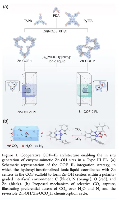 在此,报道了一种仿生型III类多孔液体,通过将Zn²⁺配位的共价有机框架(COF)骨架与羟基功能化离子液体(IL)相结合,在流体环境中实现了类酶的Zn-OH化学吸附。