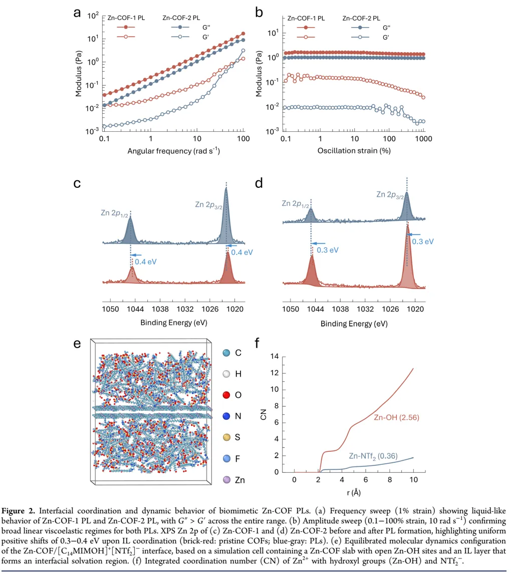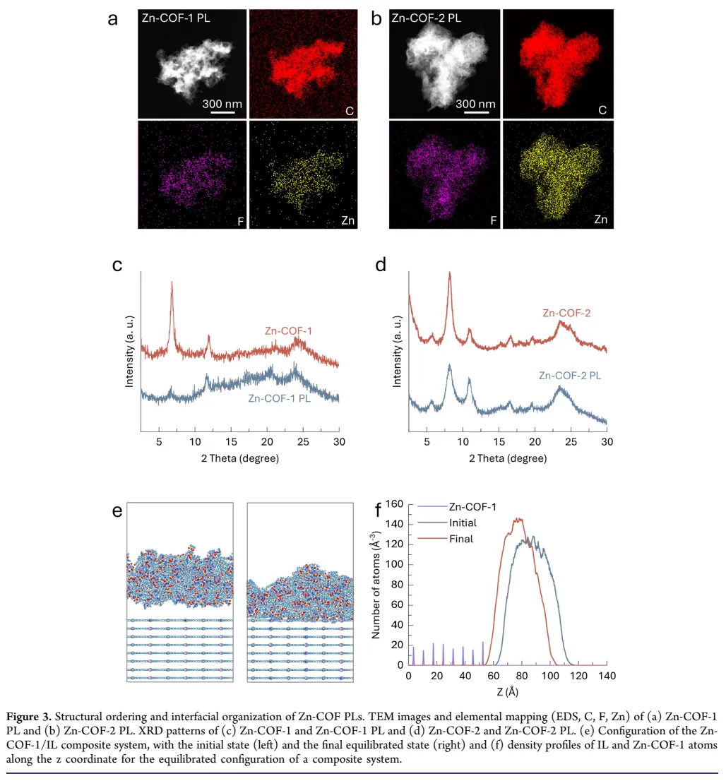 X射线光电子能谱(XPS)证实,多孔液体形成后Zn 2p₃/₂峰正移0.3–0.4 eV,表明IL羟基与Zn²⁺之间发生了配位而非氧化态改变。分子动力学(MD)模拟揭示,IL分子优先在COF外表面富集,形成界面溶剂化层,而不进入本征微孔。径向分布函数分析表明,Zn²⁺与IL羟基氧的配位数(2.56)远高于与[NTf₂]⁻的配位数(0.36),进一步验证Zn-OH位点形成的选择性。DFT计算则表明Zn-OH相互作用能(−2.16 eV)显著优于Zn-[NTf₂](−1.57 eV至−2.05 eV),从能量层面支持了上述配位偏好。透射电子显微镜(TEM)与元素面扫描确认C、Zn、F元素均匀共存于同一区域,IL与COF在纳米尺度高度整合。粉末X射线衍射(PXRD)证实COF骨架晶体学有序性在液相中完好保留。氙气吸附测试进一步验证,分散于IL后COF本征微孔仍然开放可及。气体吸附性能