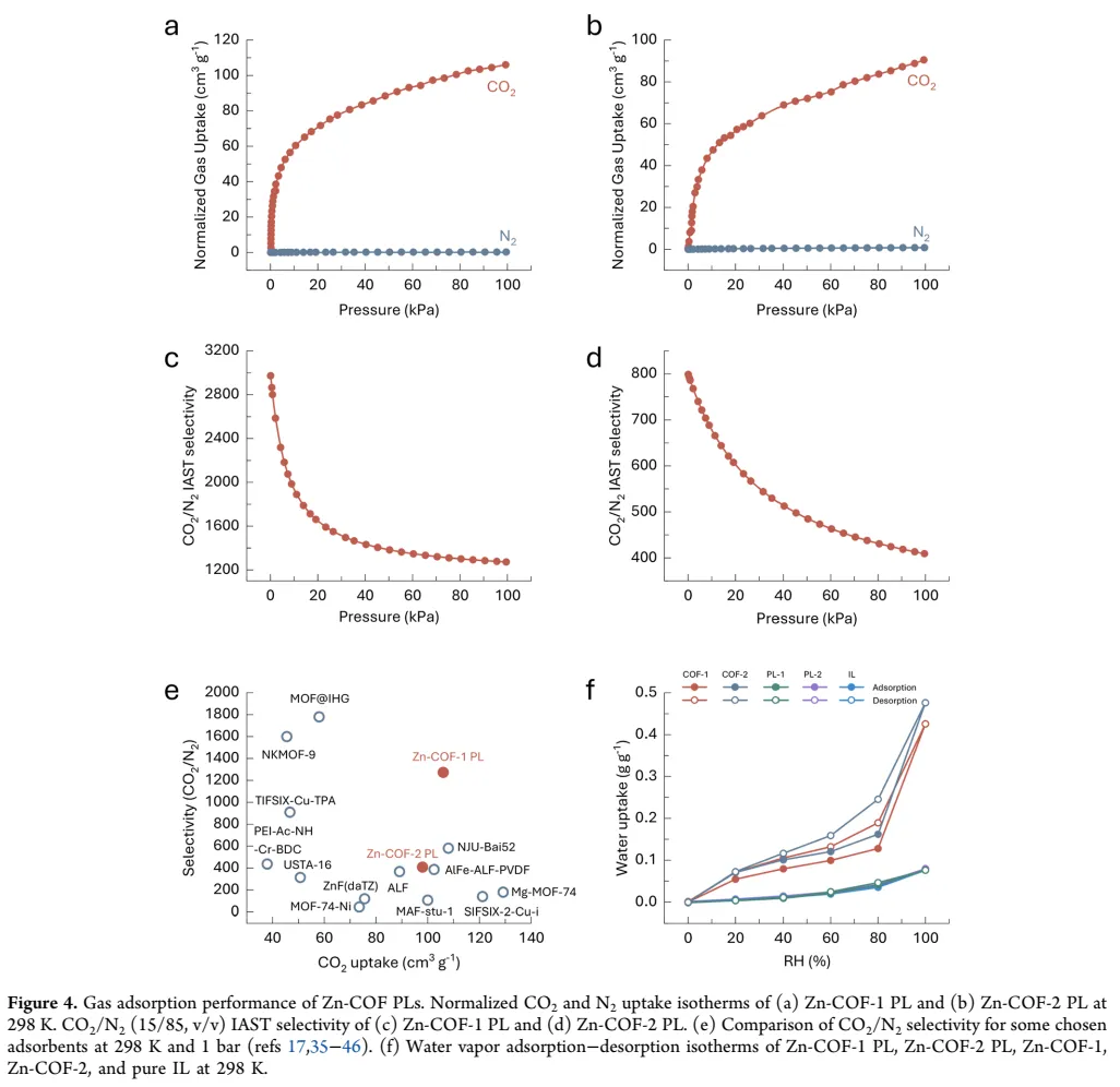 Zn-COF PLs在298 K下呈现陡峭的低压CO₂吸附上升与明显的吸附–脱附迟滞,表征其化学吸附特征;Zn-COF-1 PL的CO₂吸附量达106 cm³ g⁻¹(以框架质量归一化,298 K,1 bar)。基于理想吸附溶液理论(IAST)计算的CO₂/N₂(15/85 v/v)选择性,Zn-COF-1 PL和Zn-COF-2 PL分别达1273和409,在已报道吸附材料中处于领先水平。吸附机制可分解为两个协同贡献:低压区以Zn-OH化学吸附为主,决定了选择性分离的关键区域;高压区COF孔道填充的物理吸附逐渐增强,贡献整体容量。经120 °C热真空再生,连续8次吸附–脱附循环后CO₂吸附量保持稳定,循环后TEM和XPS均未见结构或配位环境退化。耐湿性能方面,Zn-COF PLs的水蒸气吸附量比纯COF粉末降低一个数量级以上,等温线接近纯IL,表明液相中的水吸附由离子基质界面屏蔽主导而非COF微孔吸附。经30天及3个月湿度暴露后,两种PLs均保留逾88%的初始CO₂吸附容量,展现出优异的长期湿稳定性。化学吸附机制的原位证据