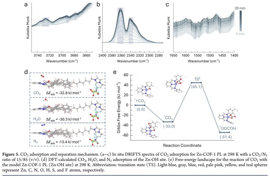 这种反直觉的界面分离策略保留了COF的微孔性并保护了反应活性Zn-OH中心,从而在环境条件下实现了高化学吸附容量(106 cm³ g⁻¹)和优异的CO₂/N₂选择性(1273)。