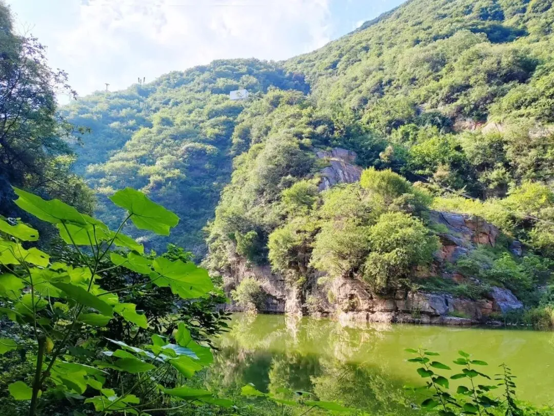 进入谷口,认准标识,在岔路口选择左拐下台阶。不一会儿,一潭绿汪汪的湖水便伴着潺潺的瀑布声映入眼帘。