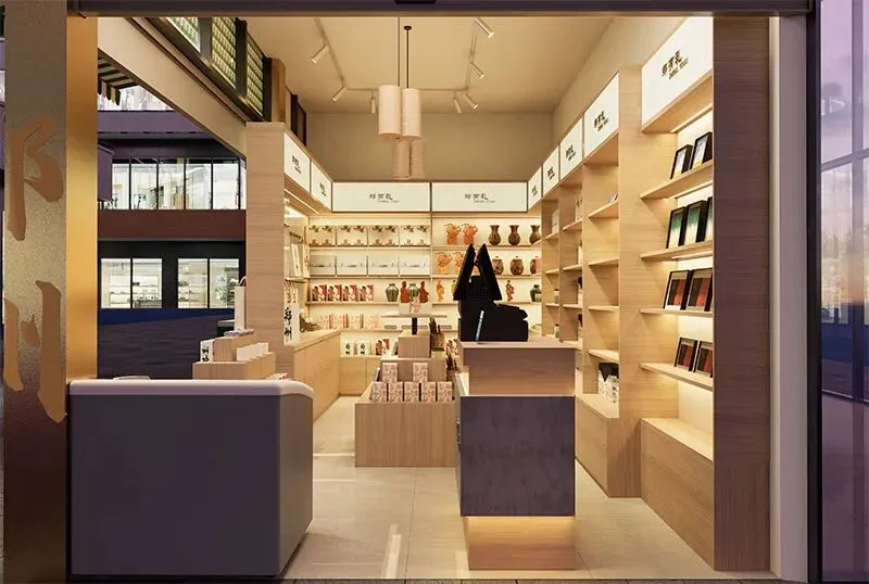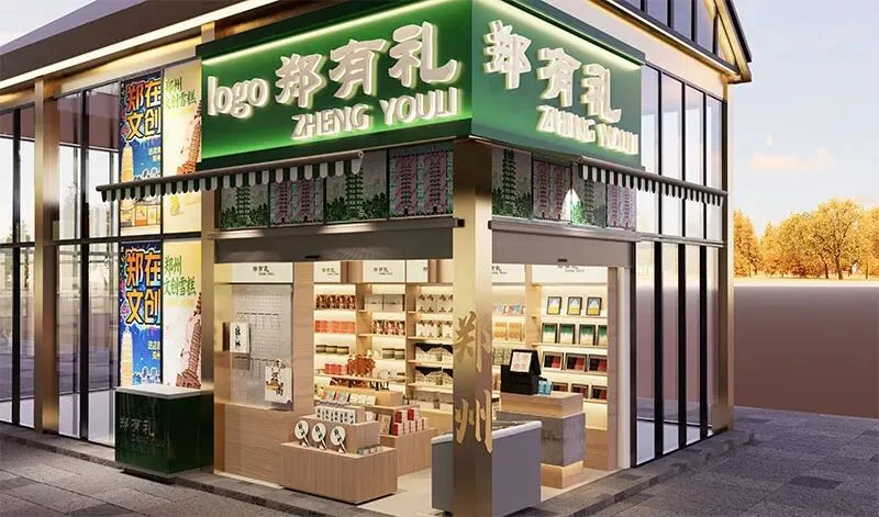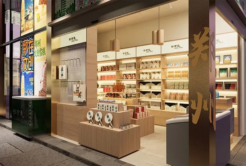 店内动线清晰,中岛展陈与侧墙货架分区合理,兼顾展示与选购体验;简约吊灯与线性灯营造舒适氛围,整体设计在现代商业感中注入国风底蕴,让游客在购物中感受郑州文化温度。