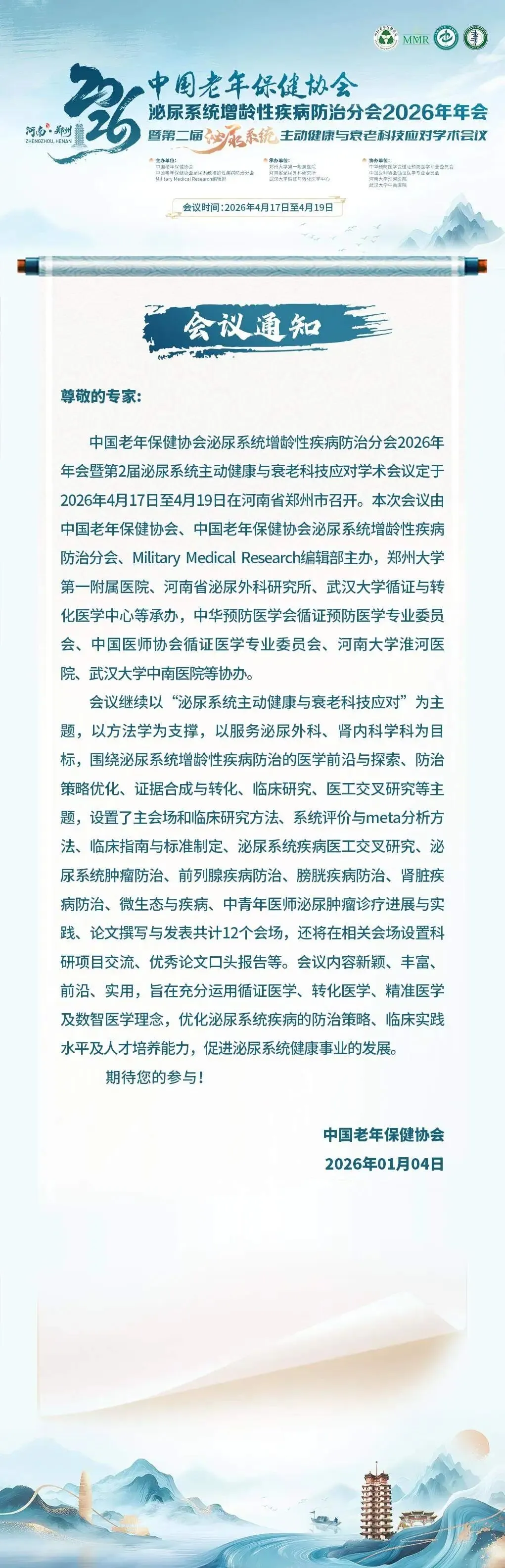 【河南郑州 2026年4月17-19日】中国老年保健协会泌尿系统增龄性疾病防治分会2026年年会暨第2届泌尿系统主动健康与衰老科技应对学术会议