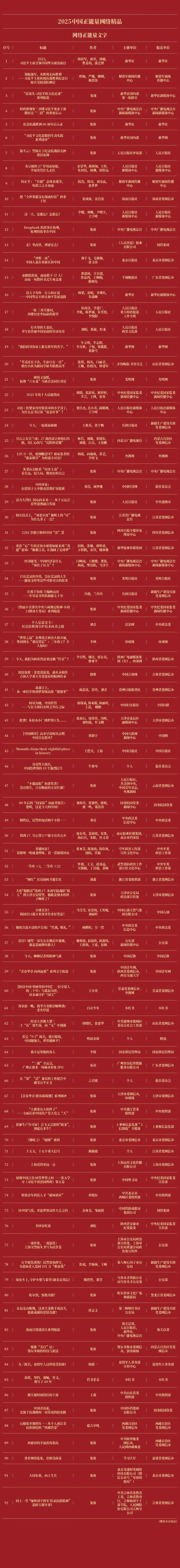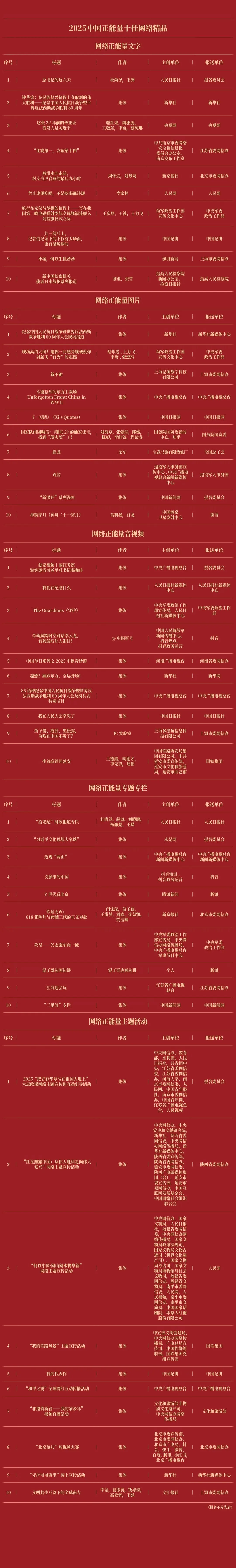 由中央网信办主办的2025中国正能量网络精品征集展播活动3月29日揭晓结果,经过大众评审、专家评议、评委线上打分和线下评审以及结果公示,50件十佳网络精品及500件网络精品脱颖而出,名单如下: