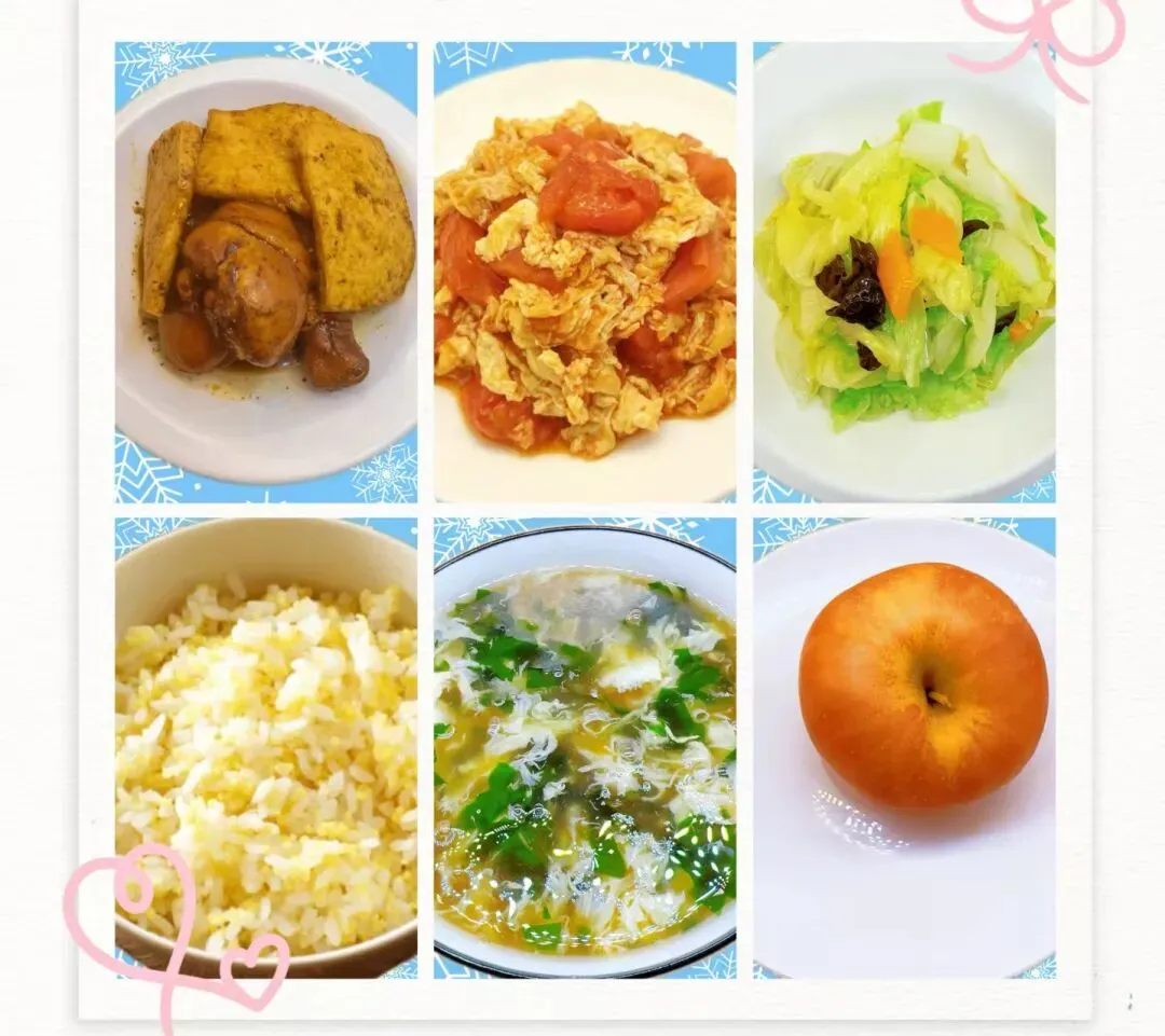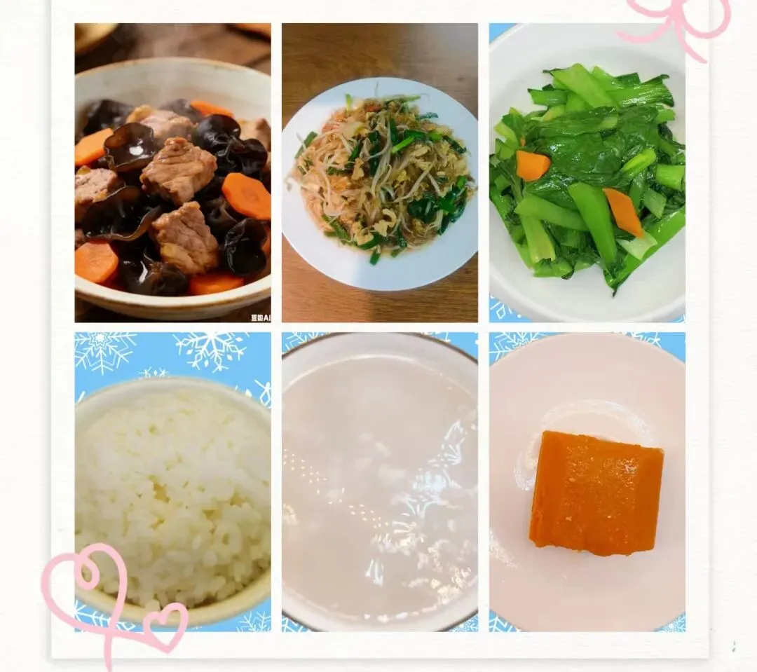 西红柿鸡蛋汤:西红柿块5g,干黑木耳丝2g,金针菇段2g,千张丝2g,洁净鸡蛋5g。