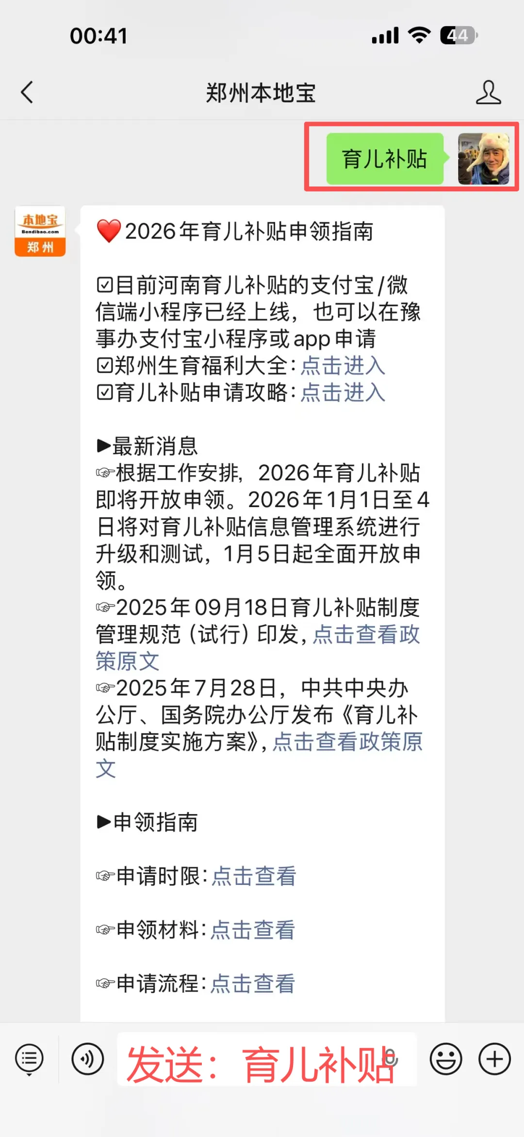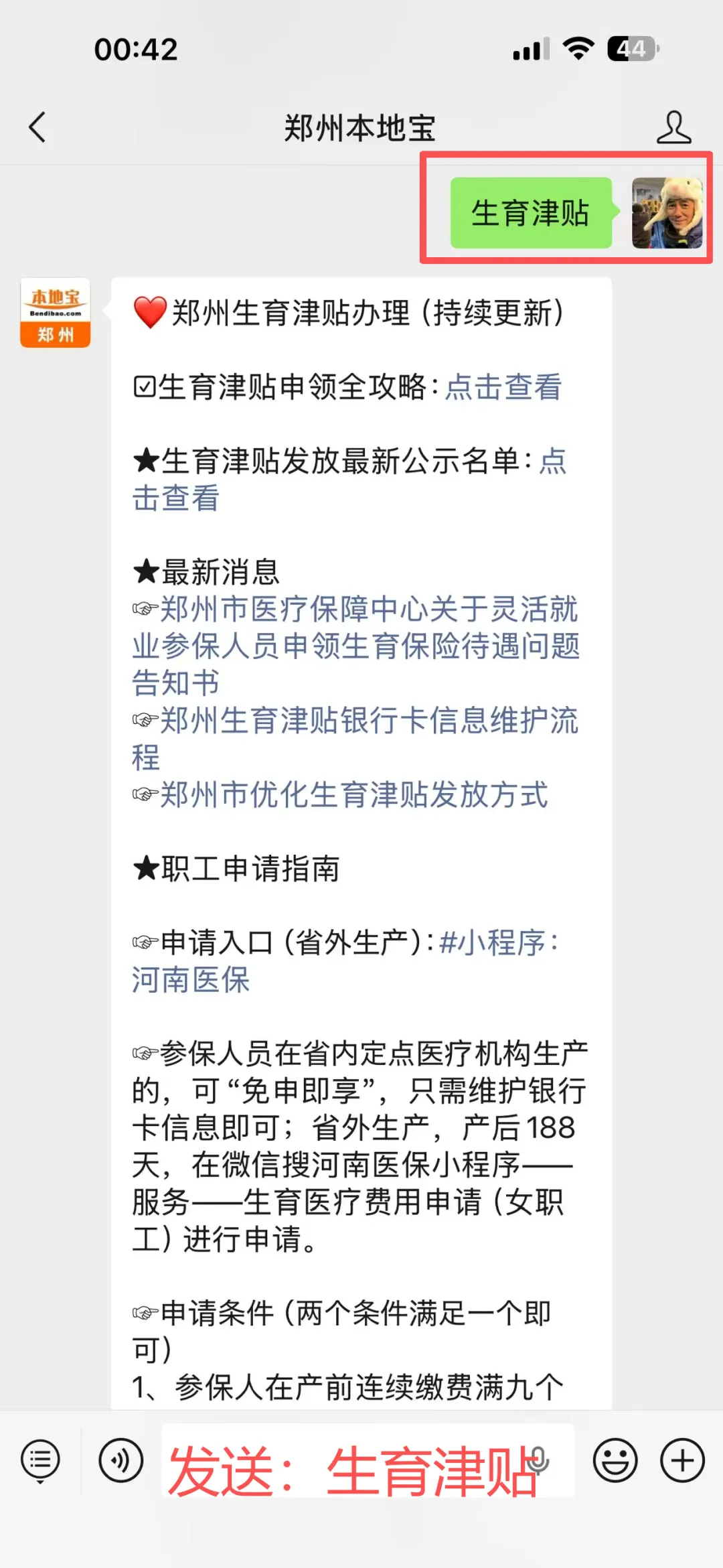 ✅查询小助手:点击左下角的头像进入【郑州本地宝】公众号,在后台聊天对话框内发送【生育保险】,即可查看郑州生育保险相关内容
