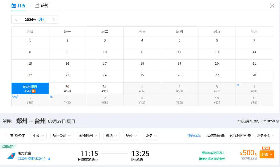 3月29日起,南方航空将在郑执行航线51条,重点加密郑州至粤港澳大湾区、新疆、内蒙古等地航班,新开郑州至乌海、锡林浩特、台州航线(台州此前未有直飞航线),加密郑州—吉隆坡航线至每天1班;