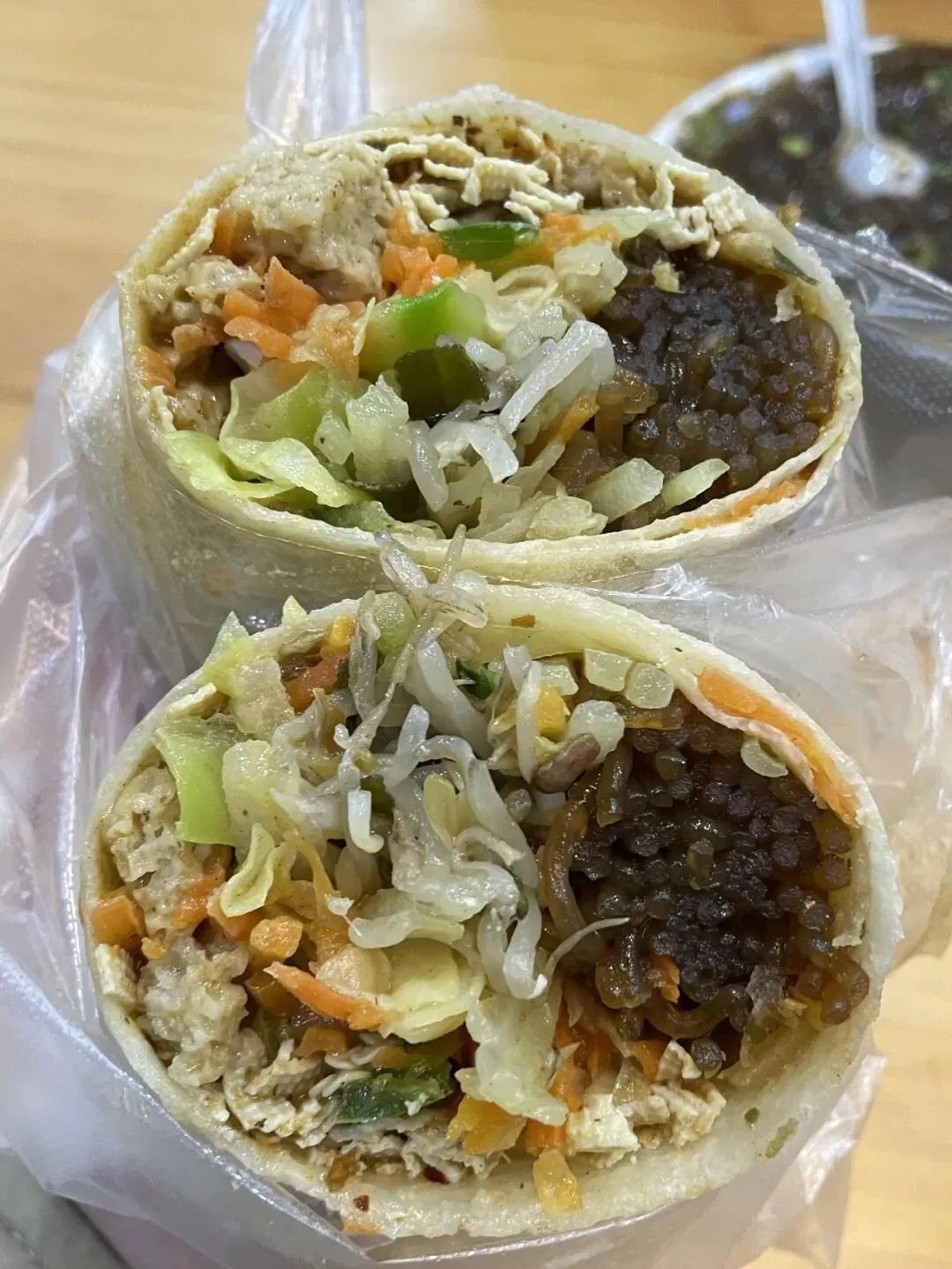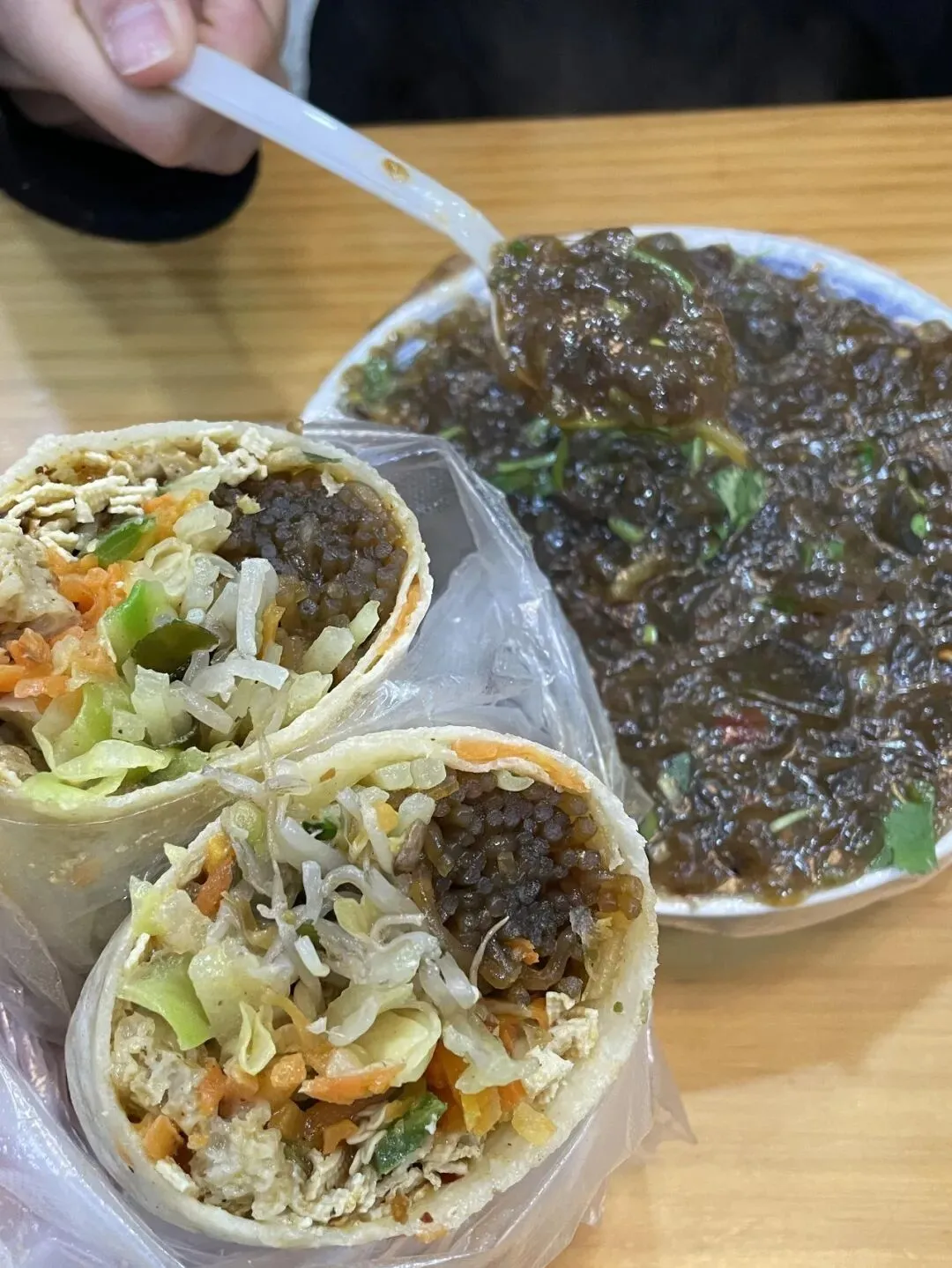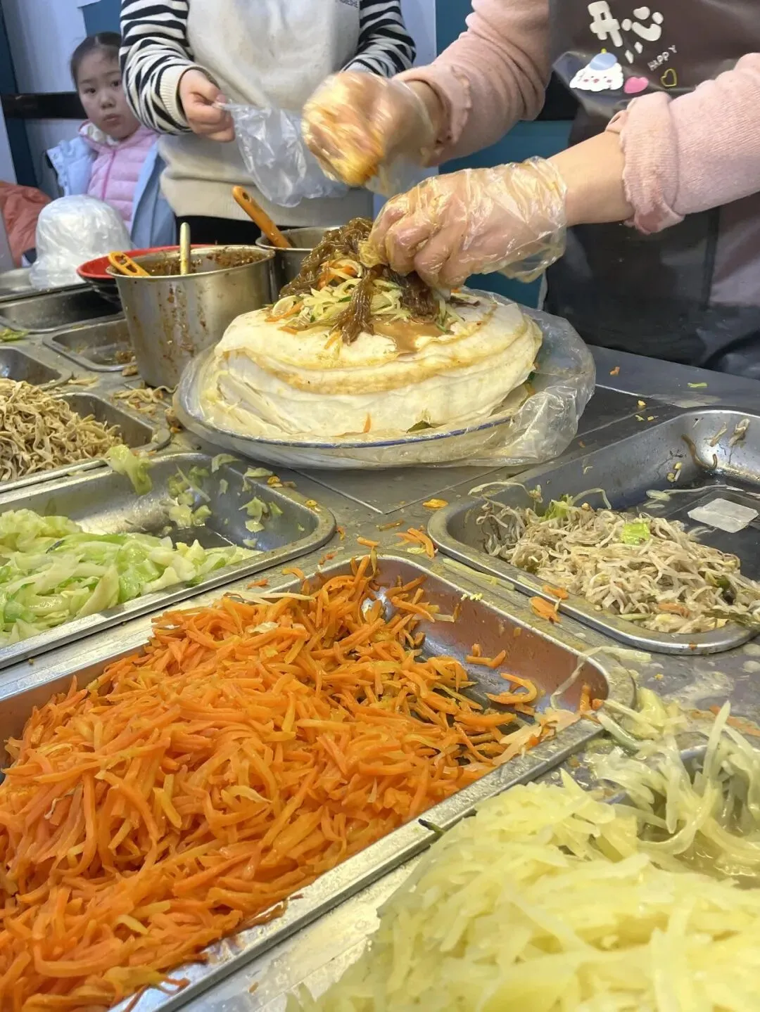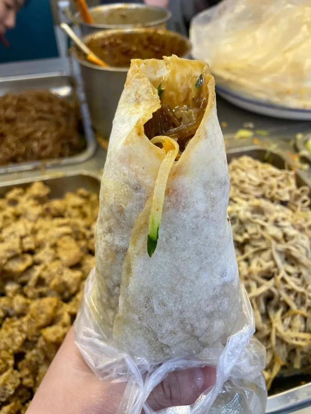 你看老板这摊,摆了得有十几种素菜吧,胡萝卜丝包菜丝土豆丝,还有千张跟吸满味的粉条,老板哐哐往上浇厚厚的芝麻酱,那香劲儿直冲天灵盖啊。卷饼的时候直接上手抓馅,塞得满满当当都快溢出来,卷完老大一个,我一只手都快握不住,拿到手里暖乎乎的,麻酱香直往鼻子里钻。