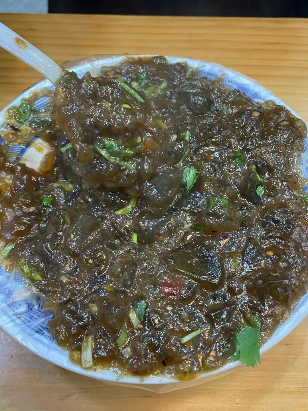 我当时还搭了一碗他们家的炒凉粉,就是这个你们看,炒得亮晶晶黏糊糊的,撒上香菜跟红辣子,挖一口下去,滑溜溜沙沙的,入口全是酱香味,太绝了。
