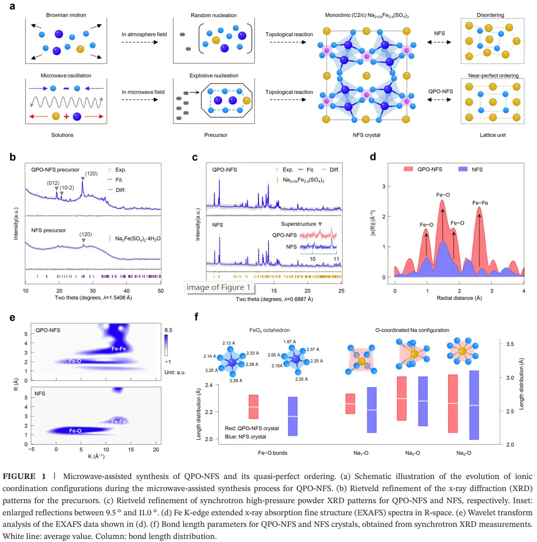 图 1 展示了微波辅助合成QPO-NFS的机制与结构表征:示意图呈现微波场中离子定向成核替代随机成核的过程;XRD精修证实前驱体结晶度高,目标产物存在超结构特征峰;EXAFS与小波变换分析表明QPO-NFS的Fe–O、Fe–Fe键有序性更高;键长分布数据显示其Fe–O、Na–O键长离散度显著低于普通NFS,直接验证了“准完美有序”结构的成功构建。