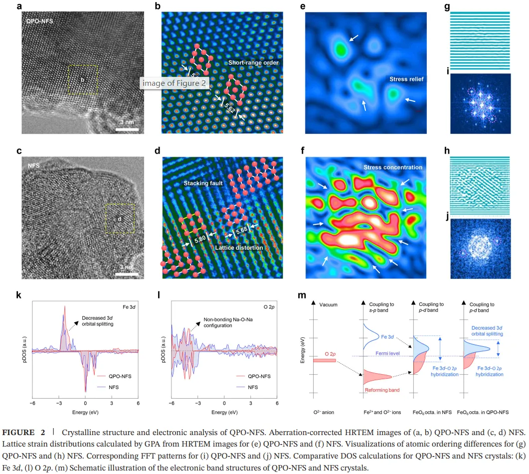 图 2 通过高分辨表征与理论计算揭示QPO-NFS的结构与电子优势:HRTEM显示QPO-NFS原子排列规整、无明显缺陷,而普通NFS存在堆垛层错与晶格畸变;GPA应变分析表明QPO-NFS应力集中区域极少;DOS计算显示其Fe 3d轨道分裂减弱、Fe 3d–O 2p杂化增强,Na–O键在费米能级附近呈非键特征,既提升电子导电性,又降低Na⁺迁移能垒,从结构与电子层面解释了性能提升的根源。