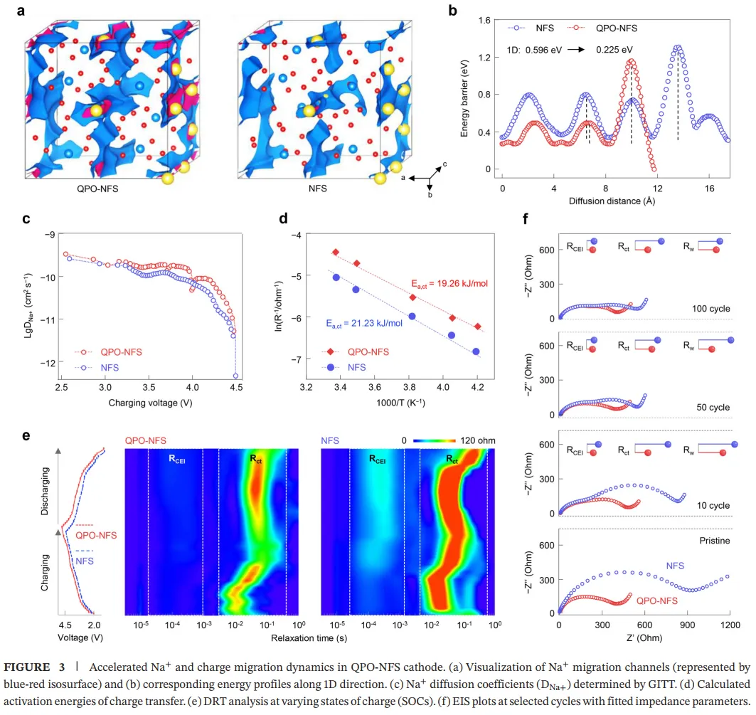 图 3 聚焦QPO-NFS的离子传输动力学:BVS分析与DFT计算展示其连通性更佳的Na⁺迁移通道,迁移能垒从0.596 eV降至0.225 eV;GITT测试表明其Na⁺扩散系数(5.33×10⁻¹⁰ cm²/s)较普通NFS提升一个数量级;DRT与EIS分析证实,QPO-NFS在循环过程中始终保持更低的电荷转移电阻与SEI电阻,验证了其优异的离子传输效率与界面稳定性。