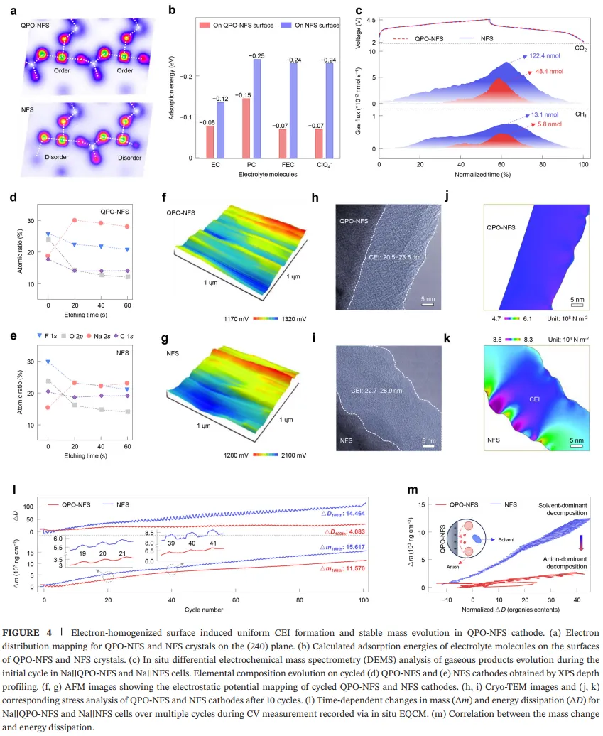 图 4 探究QPO-NFS的表面电子分布与CEI特性:电子分布图谱显示QPO-NFS表面O原子排列周期性均匀,普通NFS存在局部电子缺失;DFT计算与原位DEMS证实其对电解液分子吸附更弱,产气(CO₂、CH₄)量减少52.9%–60.5%;XPS深度剖析、AFM与Cryo-TEM显示,QPO-NFS形成厚度均匀(20.5–23.6 nm)、应力适中(4.7–6.1 GPa)的致密CEI,而普通NFS的CEI厚且不均,易引发电解液持续分解。