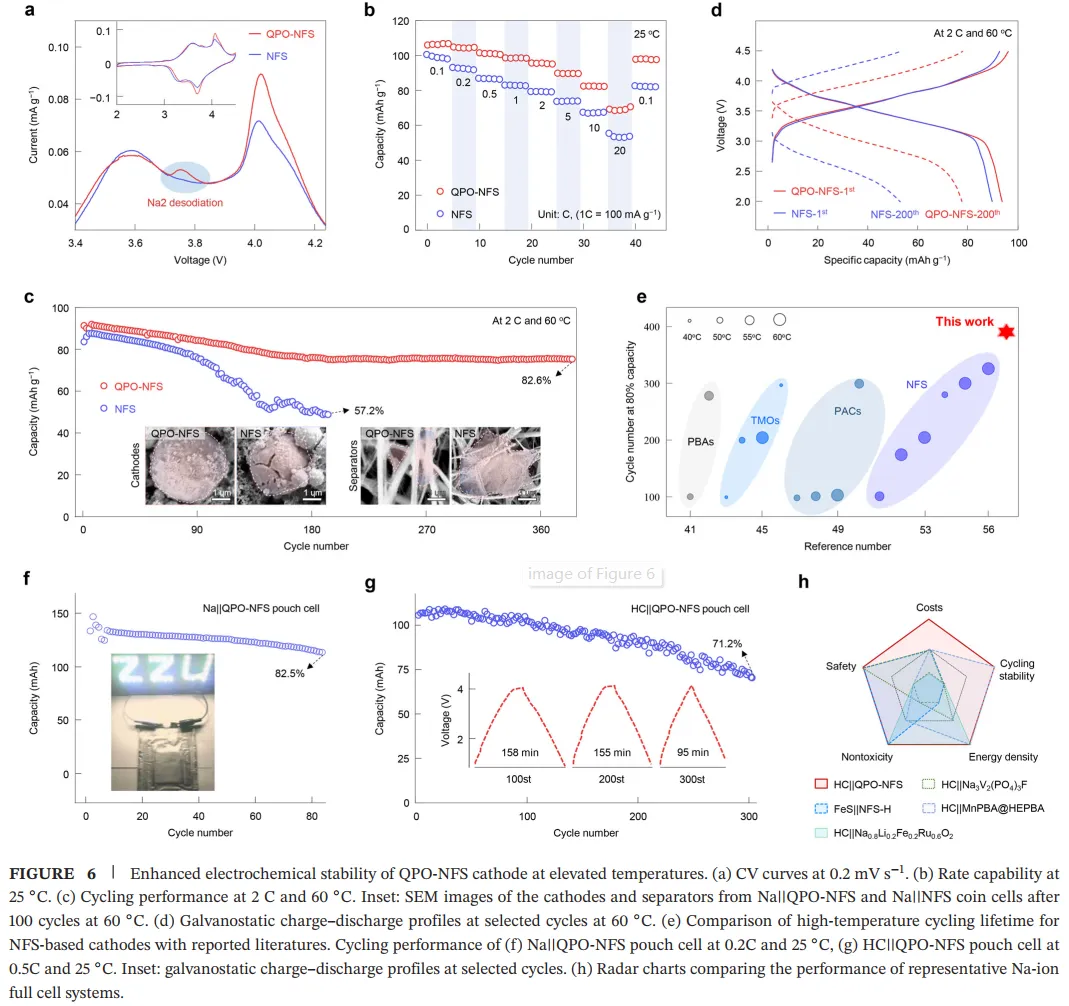图 6 展示QPO-NFS的电化学性能与实用化验证:CV曲线显示其氧化还原峰更尖锐,反应动力学更快;倍率测试表明2000 mA/g下容量达70.2 mAh/g,优于普通NFS的58.5 mAh/g;60 ℃高温循环中,QPO-NFS在390次循环容量保持82.6%,远超普通NFS的200次57.2%;软包电池测试显示,Na||QPO-NFS循环80次容量保持82.5%,HC||QPO-NFS循环300次保持71.2%,能量密度达133.7 Wh/kg,验证了其实际应用潜力。