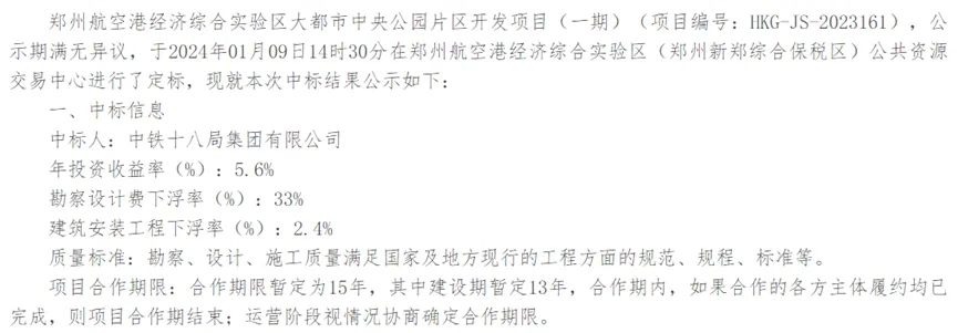 2024年1月10日,中铁十八局集团有限公司中标郑州航空港经济综合实验区大都市中央公园片区开发项目(一期);中标年投资收益率5.6%,勘察设计费下浮率33%,建筑安装工程费下浮率2.4%。