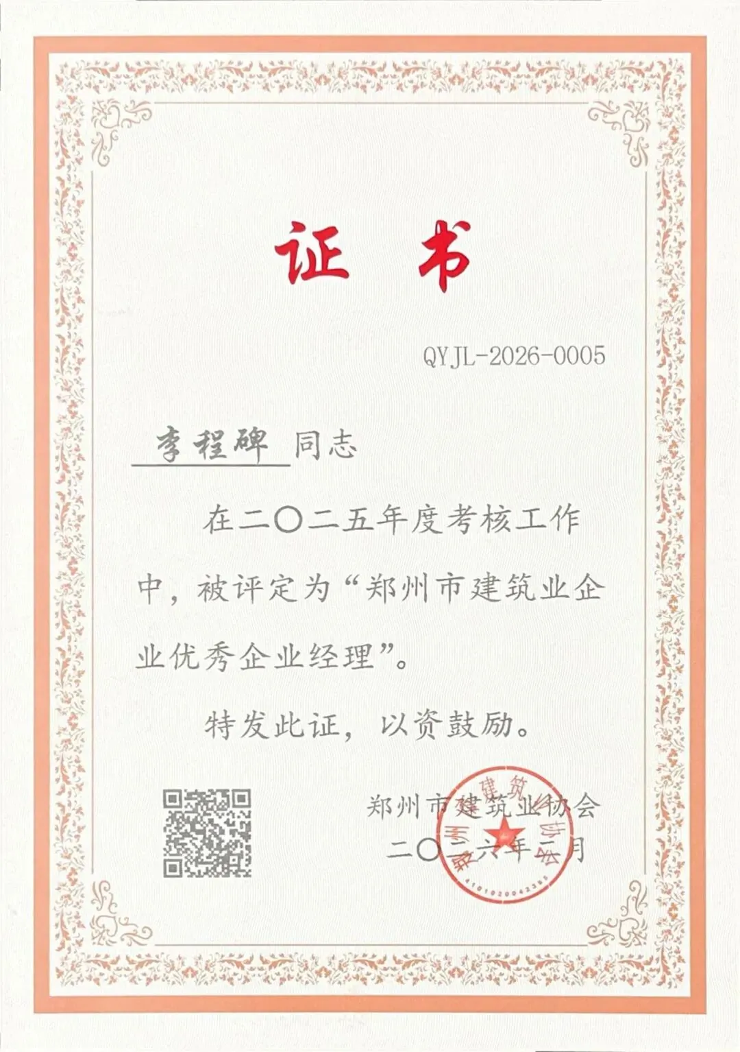 董事长李程碑同志荣获“郑州市建筑业企业优秀经理”荣誉称号。