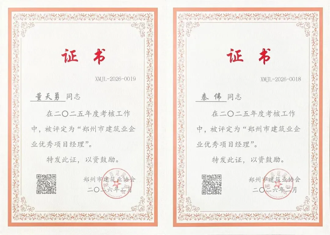 董天勇、秦伟同志荣获“郑州市建筑业企业优秀项目经理”荣誉称号。