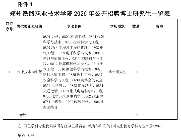详见附件《郑州铁路职业技术学院2026年公开招聘博士研究生一览表》。