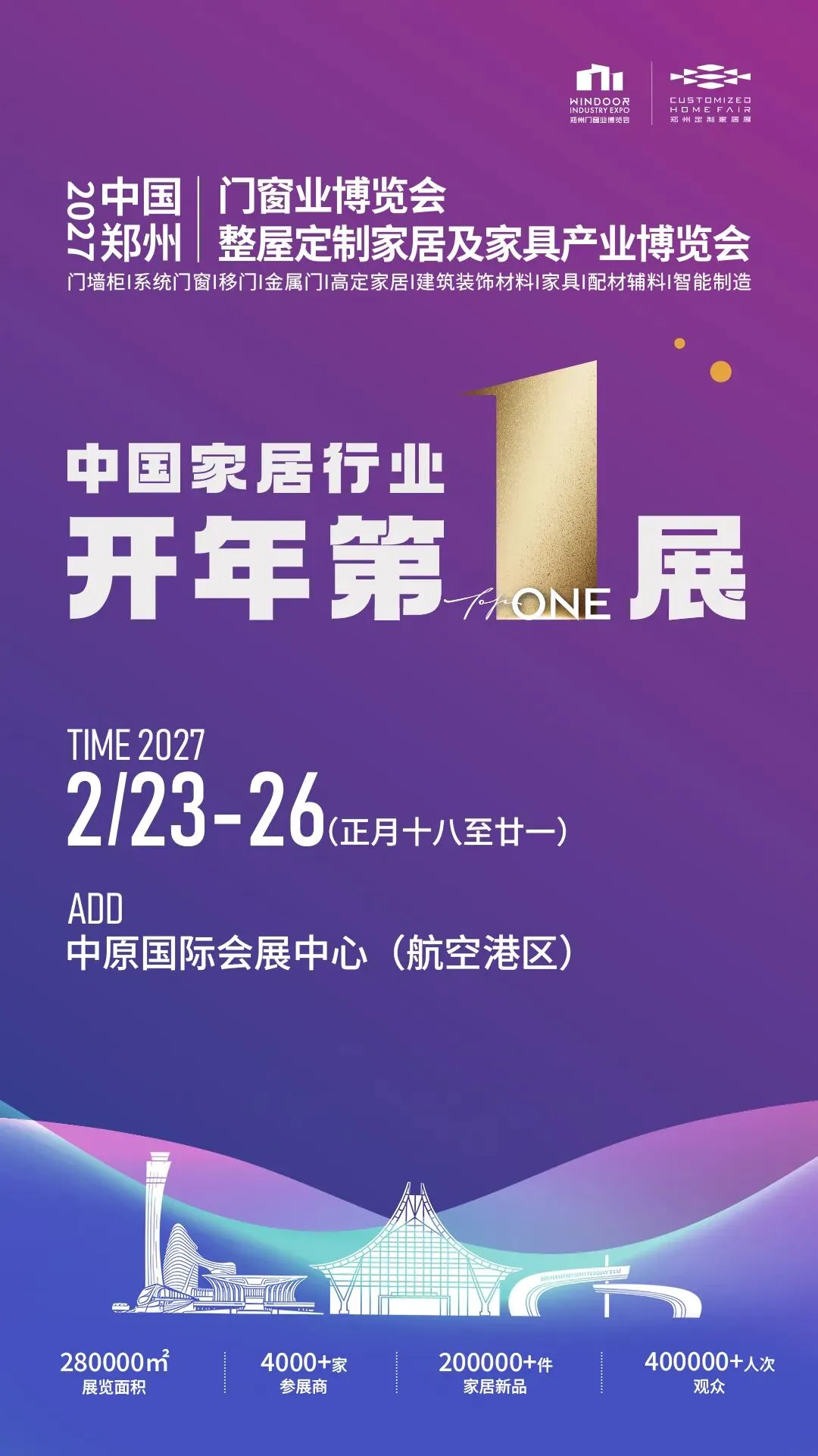 2027年2月23日-26日,2027中国郑州门窗业暨整屋定制家居及家具产业博览会将在中原国际会展中心(郑州航空港区)盛大启幕。本届展会将全面升级规模品质与商贸服务,贯通家居全产业链,汇聚行业精英与优质资源,打造更高端、更高效、更具影响力的产业对接平台。我们诚挚邀请全国家居建材同仁、品牌商家、专业客商齐聚郑州,共探行业发展新趋势,共商产业合作新机遇,共筑生态家居美好未来!