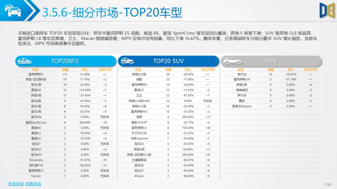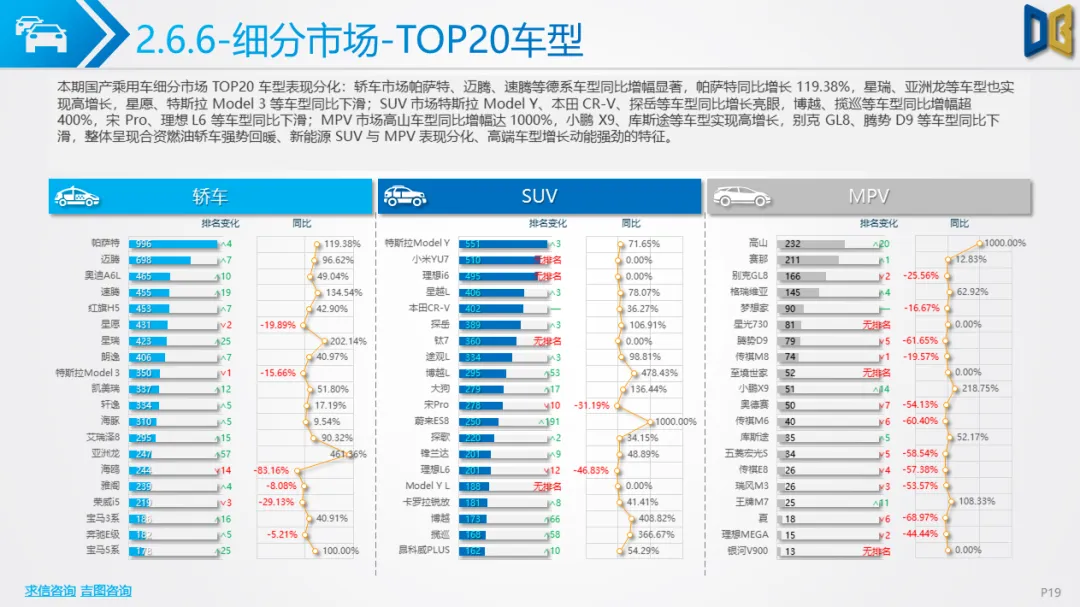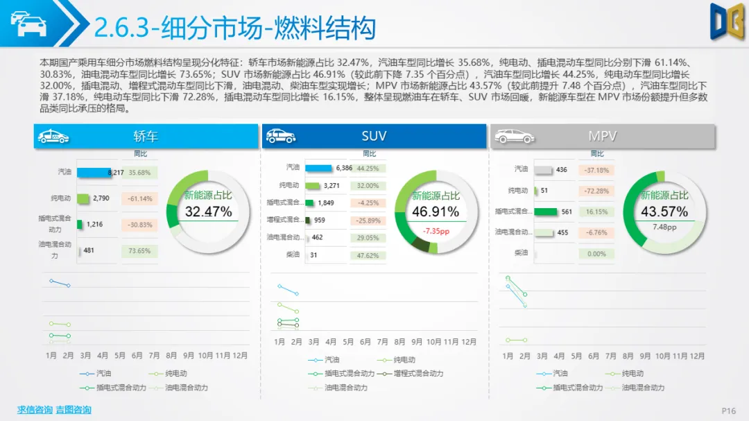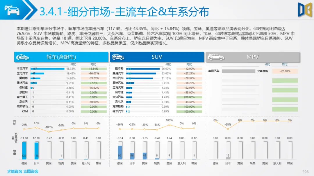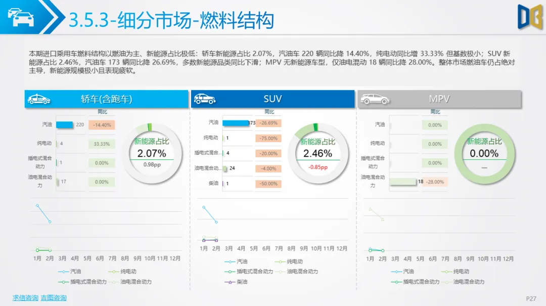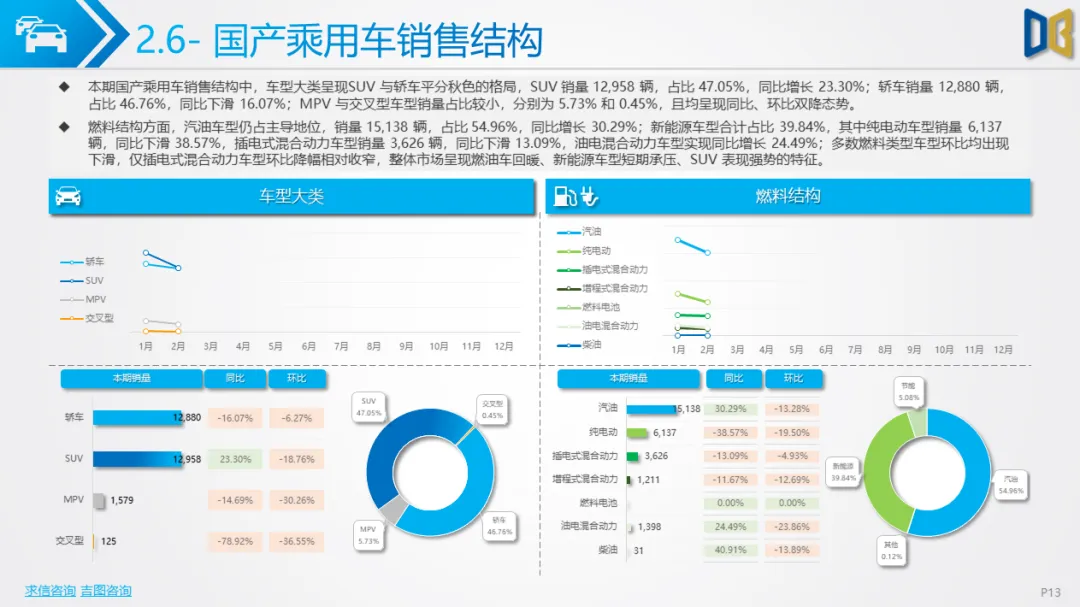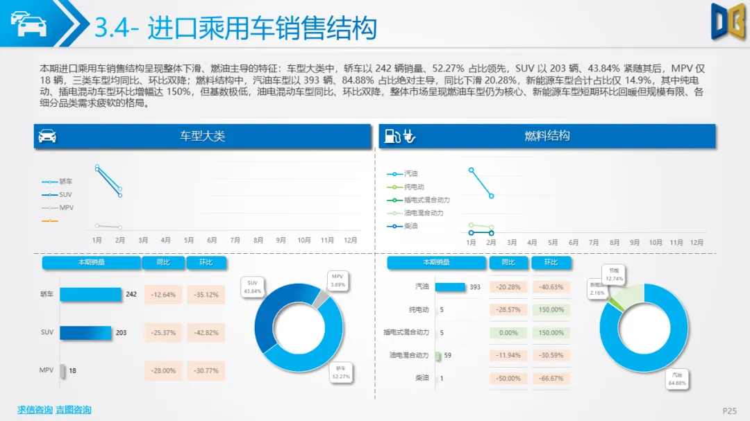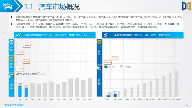 乘用车市场以中高端车型为主,进口端日系高端轿车、部分豪华SUV逆势增长,MPV市场高度集中且疲软;国产端燃油车仍占主导,新能源占比极低(普遍低于3%),多数品类同比下滑,转型遇冷。