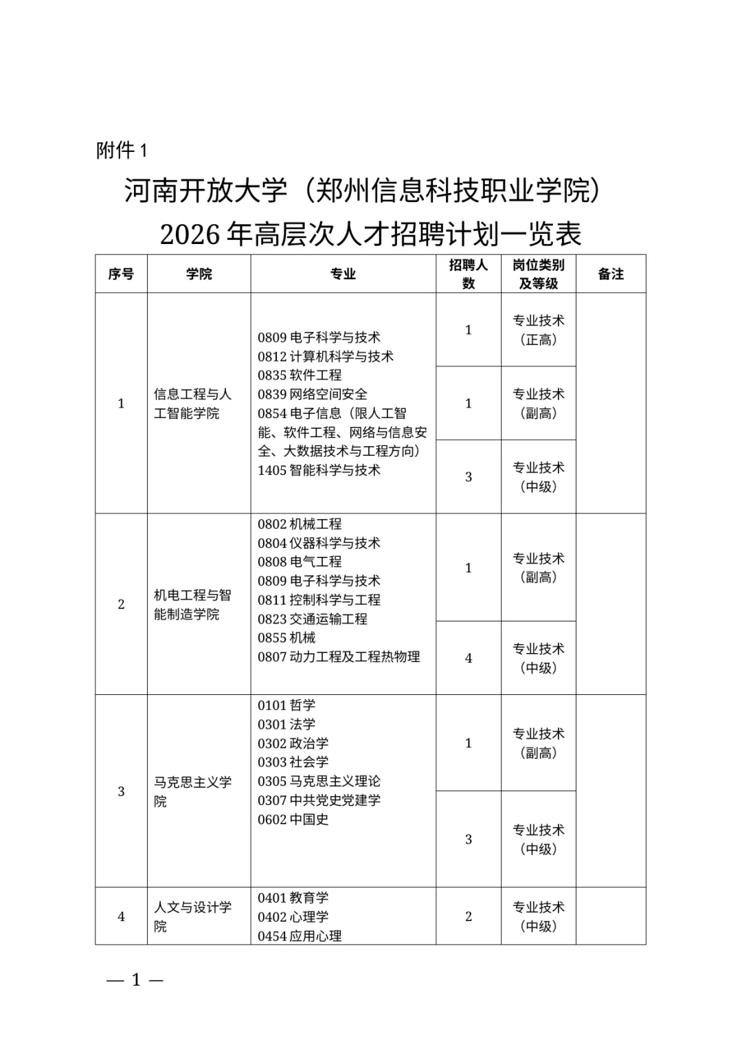 **附件:**1.河南开放大学(郑州信息科技职业学院)2026年高层次人才招聘计划一览表