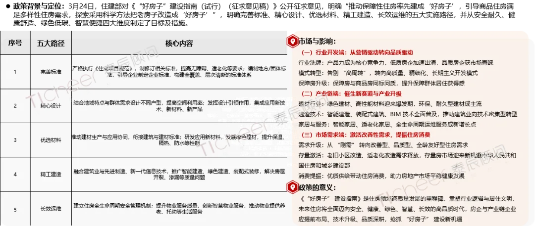 3月24日,住建部发布《“好房子”建设指南(试行)(征求意见稿)》,明确五大实施路径,标志我国住宅建设全面迈入品质优先、高质量发展新阶段,并重塑行业标准、产品结构、市场格局与居住民生价值