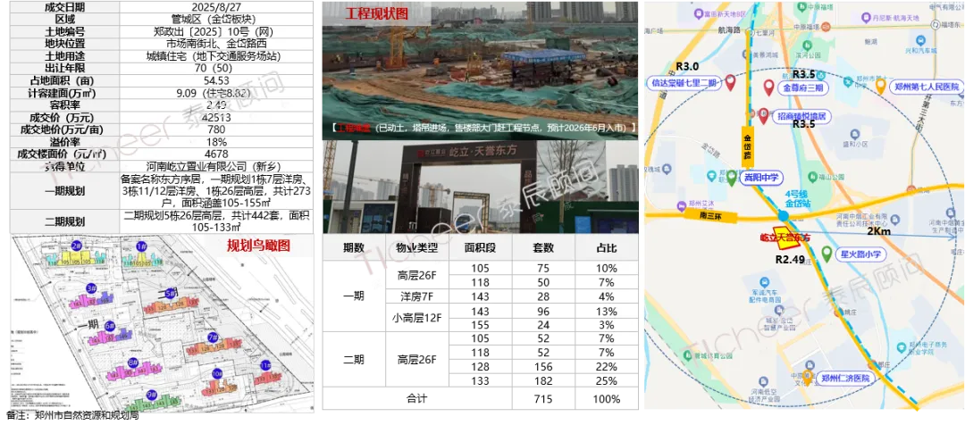 屹立天誉东方四代宅,分二期开发,规划6栋26F高层、3栋12F小高层、1栋7F洋房,共计715户,面积涵盖105-155㎡;工程方面已动土,预计2026年6月入市,项目对比周边2公里内竞品,核心优势“四代+低密高低配(2.49)+ 4号线金岱站 ”