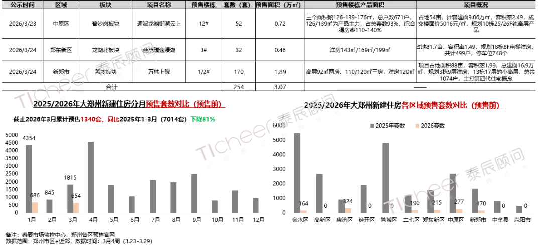 本周3个项目预售前公示,市区分别为中原区通派龙湖御潮云上及郑东新区金茂璞逸缦湖,近郊为新郑市万林上院,共计254套房源,3.07万㎡;截至目前2026年累计公示预售1340套,同比去年7014套,下降81%