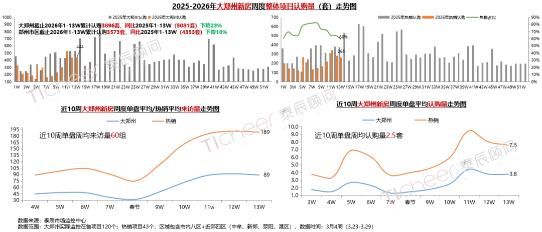 3月4周大郑州新房整体认购444套,环比+2%;其中热销盘认购265套,环比-6%,占比60%;“小阳春”末尾热度持续消退,1-13W累计认购同比去年降23%,市场复苏动能不足