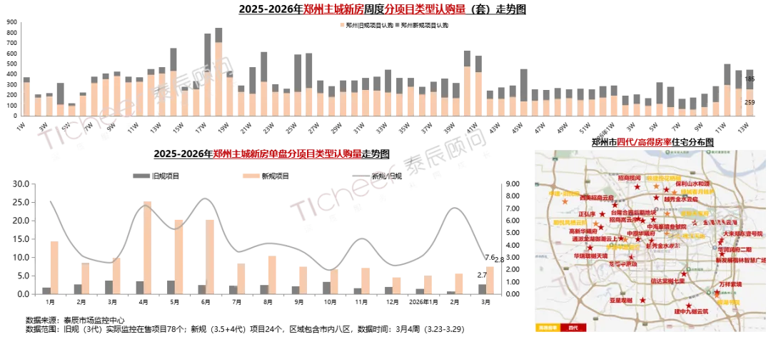 3月4周新规项目认购185套,环比+6%;旧规项目认购259套,环比-2%;新规项目单盘平均认购7.6套,旧规项目单盘平均认购2.7套,旧规项目仍占据市场主力,但需求持续向优质新规项目集中