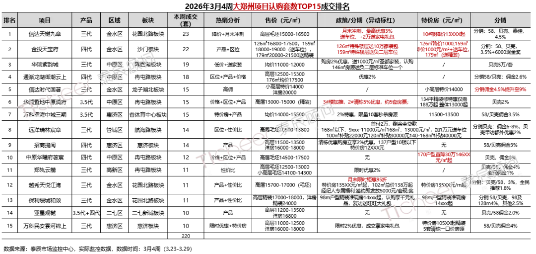 大郑州TOP15榜单合计认购220套,环比上周229套-4%,榜单门槛10套(环比-2套)前三项目靠降价、送车位及家装礼包实现显著去化;其余项目多以特价房、高佣金为主要促销手段
