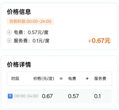 透明电价:执行透明的分时电价政策,明码标价:平时段电费+服务费为0.67元/度。此外,充电期间提供免费停车服务。