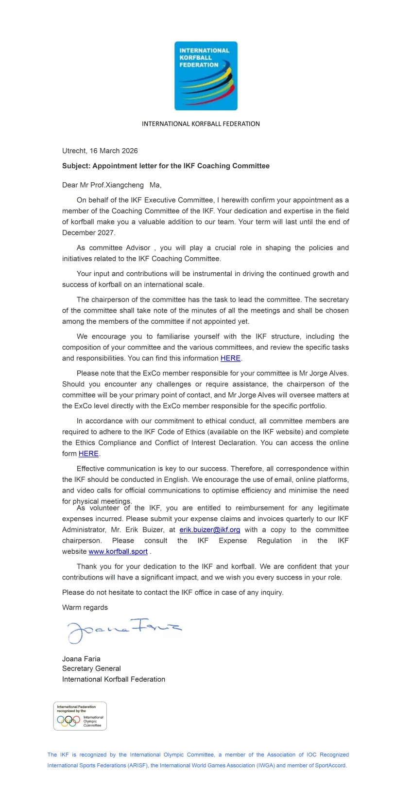 近日,国际荷球联合会秘书长乔安娜·法里亚正式签署任命文件,郑州大学运动与体育学院教授马襄城再次当选国际荷球联合会教练委员会顾问,任期至2027年12月底。马襄城教授同时担任亚洲荷球联合会委员、中国大学生荷球分会副主席、中国国家荷球队主教练。