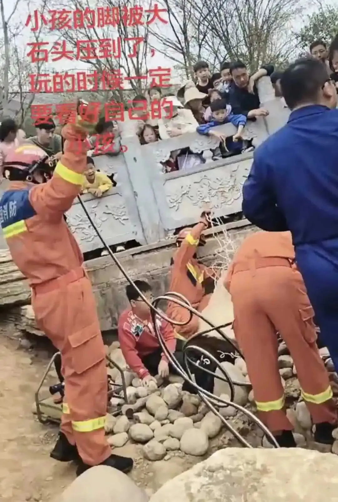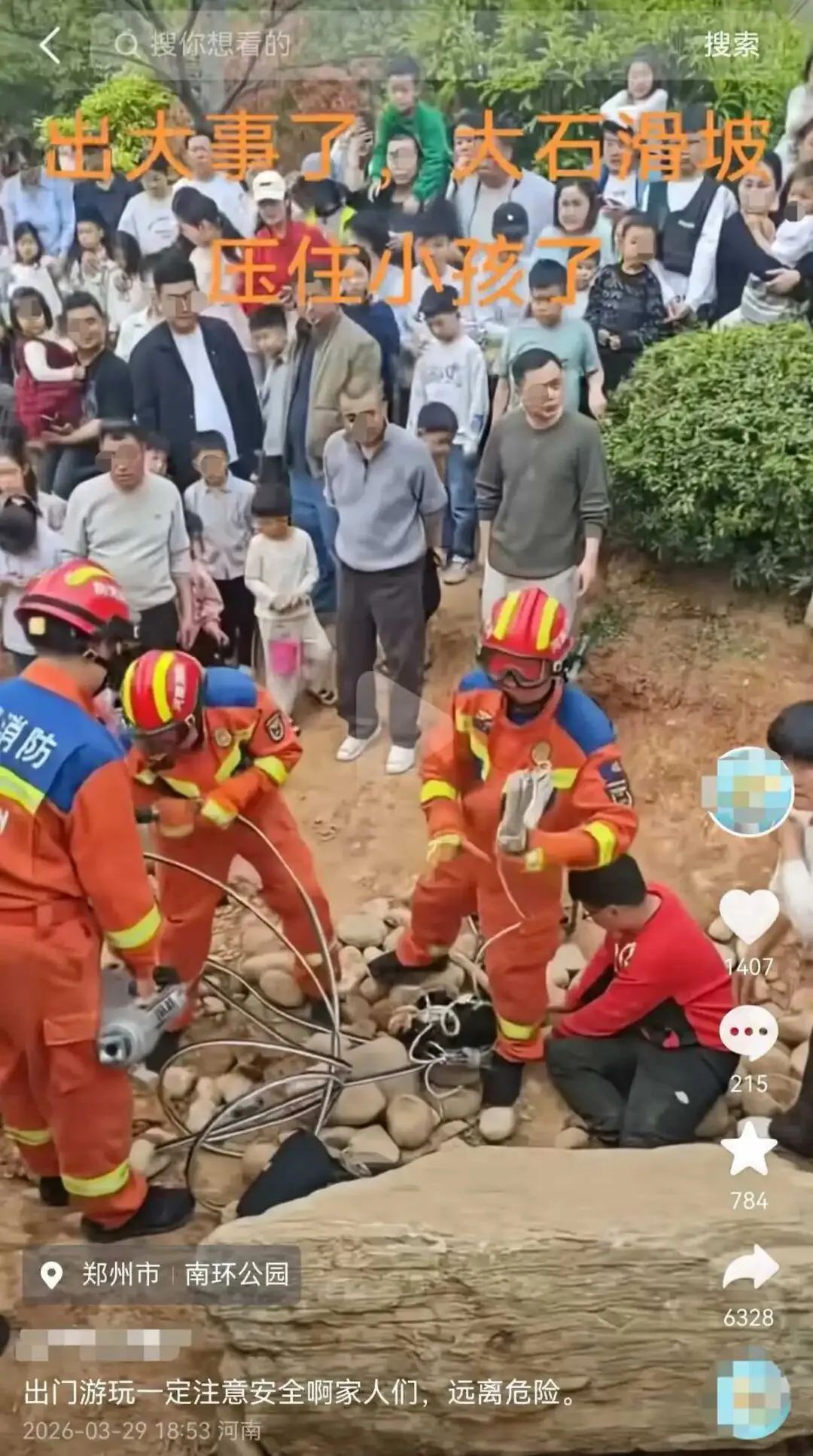 3月29日下午,多位网友发布视频称,一名小男孩在郑州南环公园游玩时,左腿被一块滑坡的大石头压住,多名消防人员正在现场施救。