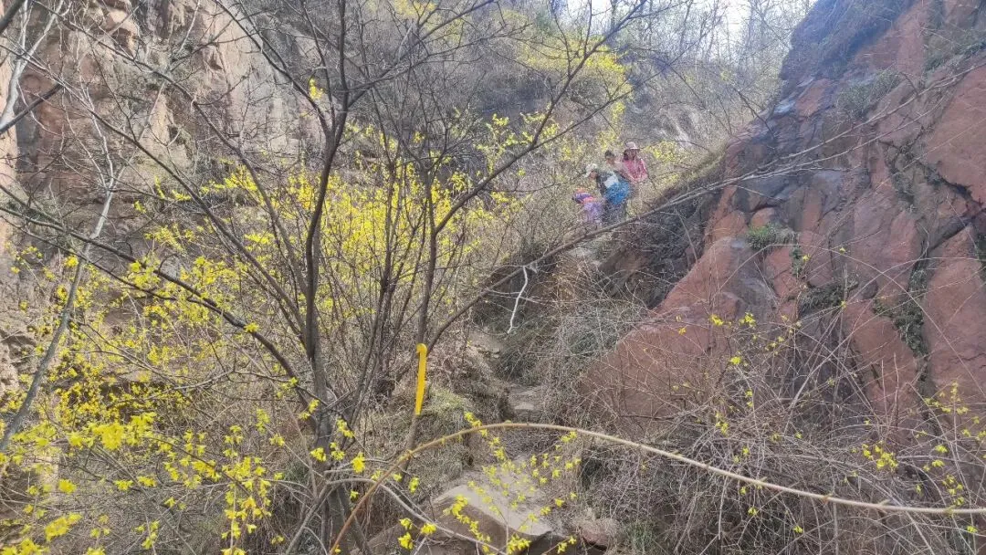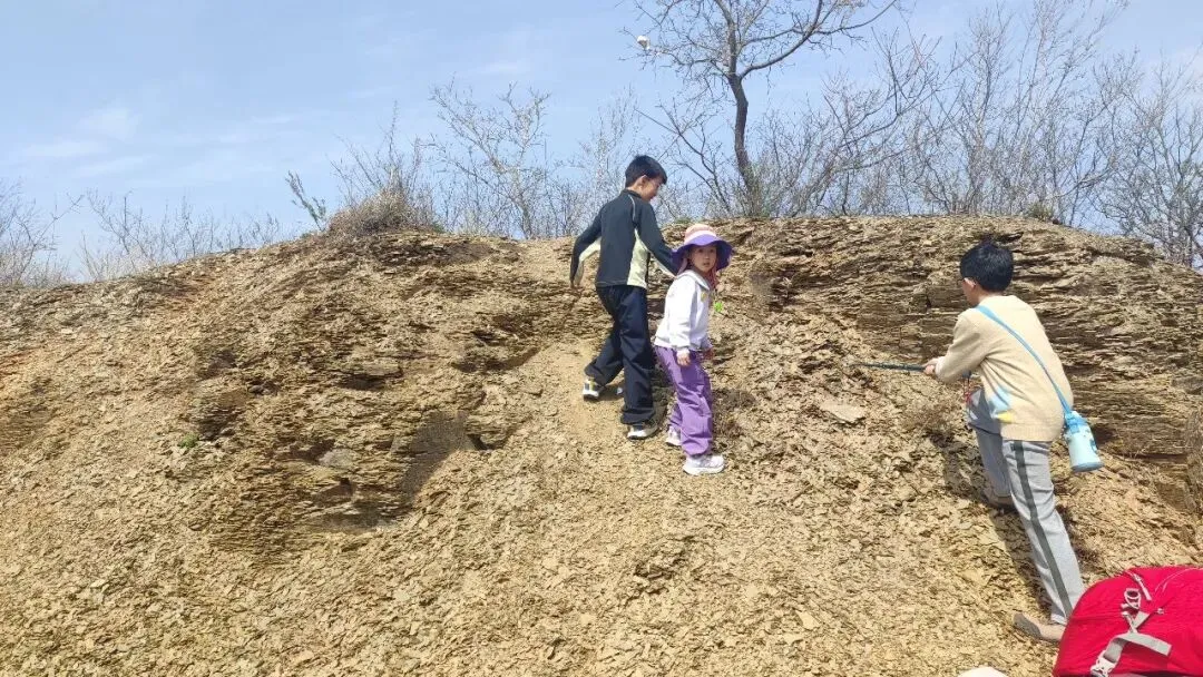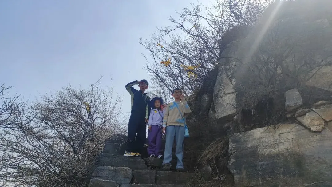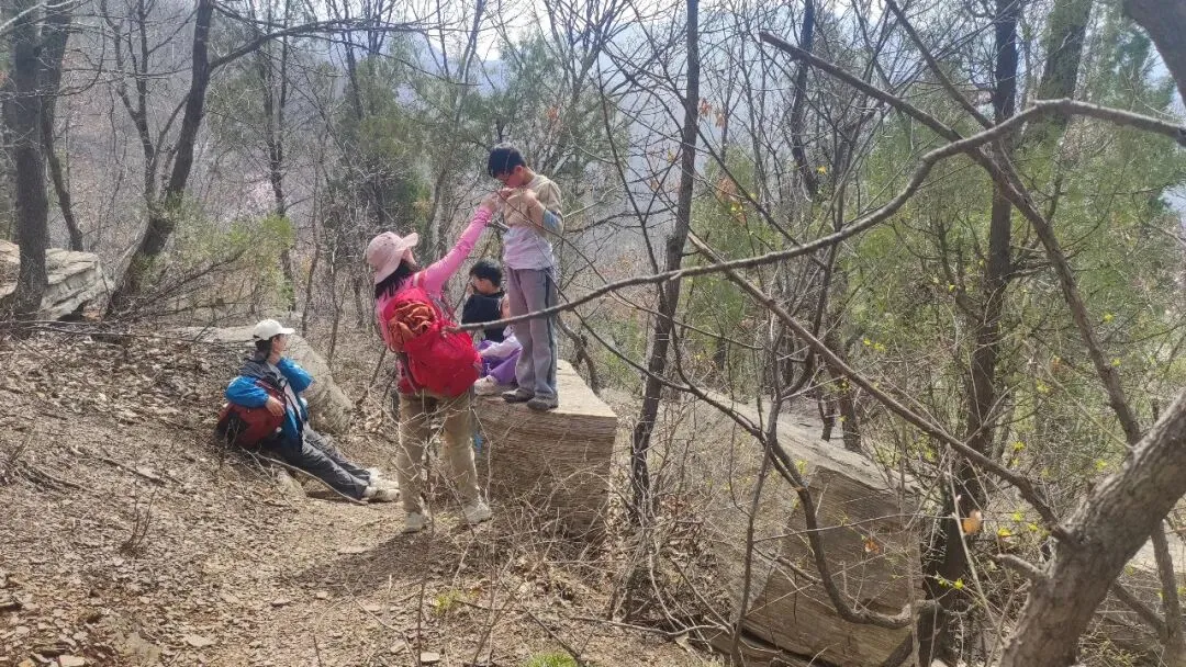 还是孩子们有劲,最小的妹妹一路领先,嘴里还给自己喊着口号“嘿、嘿、嘿、嘿”。户外真的很治愈,阳光洒在身上,初出的芽儿散发着着生命的气息,空气中都弥漫着一丝甜的味道,阵阵山风不时送来淡淡的花香,小朋友们继续拔高,加油!