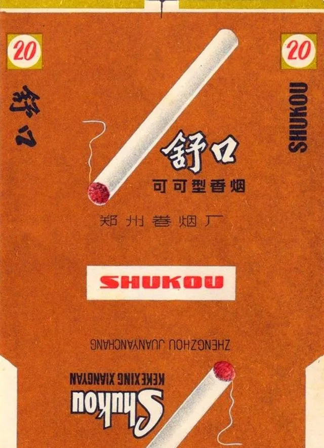 这个棕底白烟杆的叫舒口,名字图省事,意思再直白不过,就是抽起来顺,不呛人,包装下面还印着一段英文,那个年头谁看得懂,全是冲“可可型”去的,小时候谁家来了远房亲戚,都会从口袋揪出这么一包递给大人尝尝,爸爸说那个点火吸一口,烟嘴甜,味发闷,刚学会抽烟的小伙子都喜欢这个,赶集路上经常能看见卖剩下的烟纸散片飞,一脚踩上去就碎开。