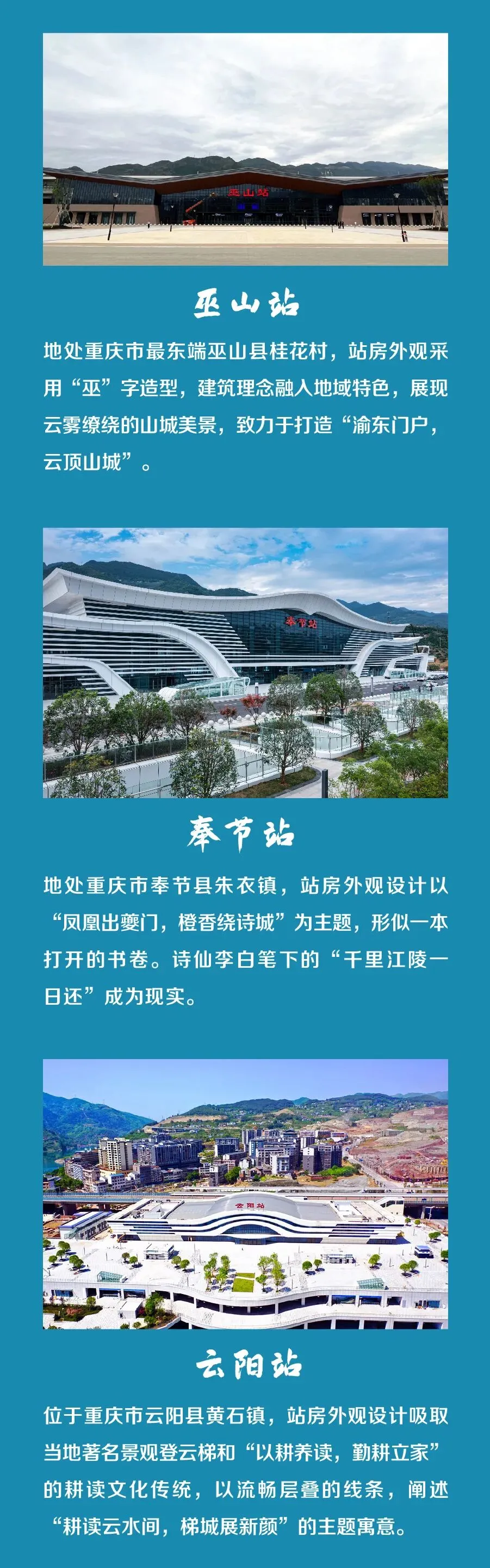 ● 本次开通的襄阳东至万州北段全长434公里,按上限标准时速350公里设计,常态化按时速310公里达标运营,途经湖北省襄阳市、宜昌市、恩施土家族苗族自治州和重庆市巫山县、奉节县、云阳县、万州区,设襄阳东、南漳、保康县、神农架、兴山、巴东、巫山、奉节、云阳、万州北10座车站。