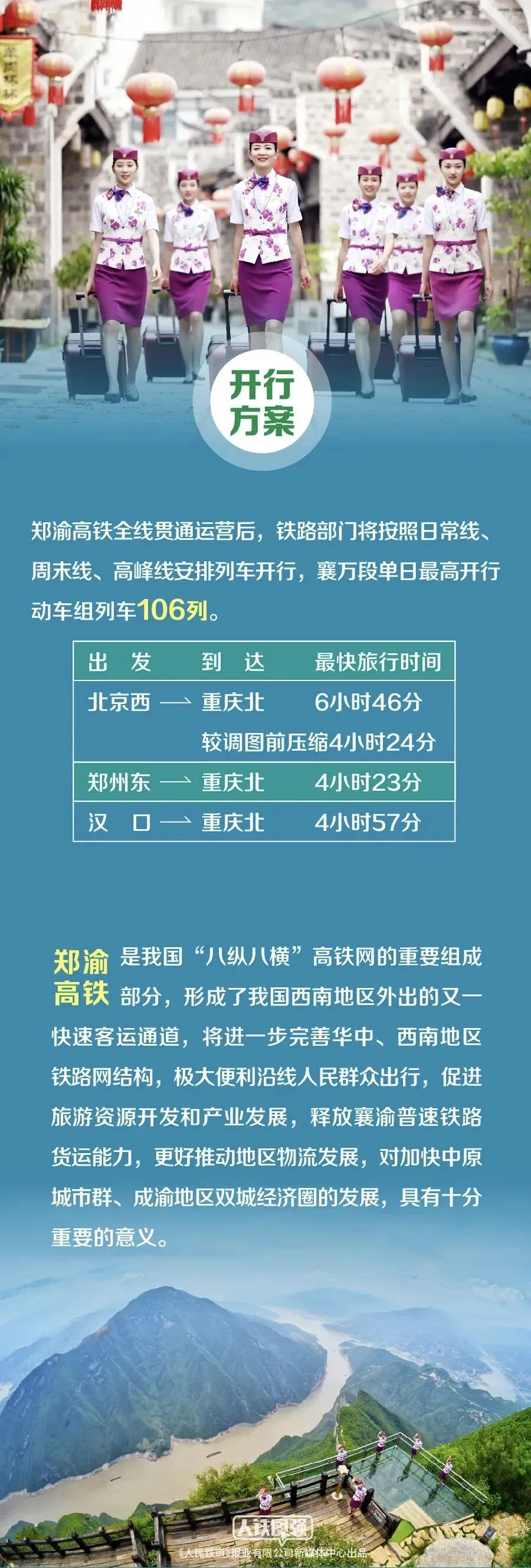 郑渝高铁全线开通运营后,铁路部门将按照日常线、周末线、高峰线安排列车开行,襄万段单日最高开行动车组列车106列,北京、天津、太原、郑州、武汉等多地至重庆将开行直达动车,北京、郑州、武汉至重庆最快分别6小时46分、4小时23分、4小时57分可达。