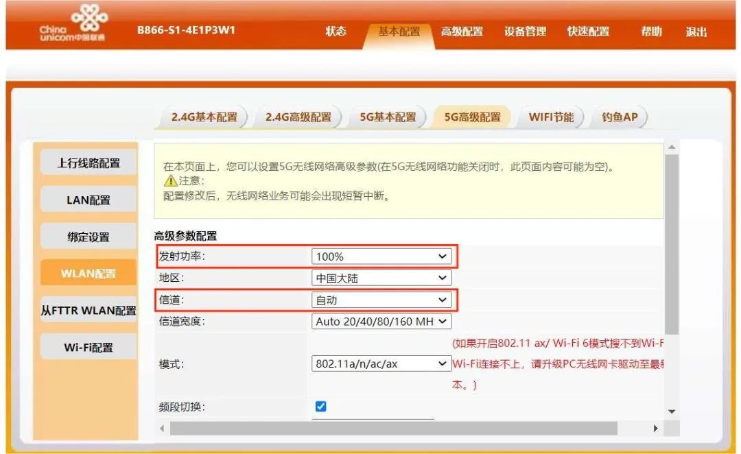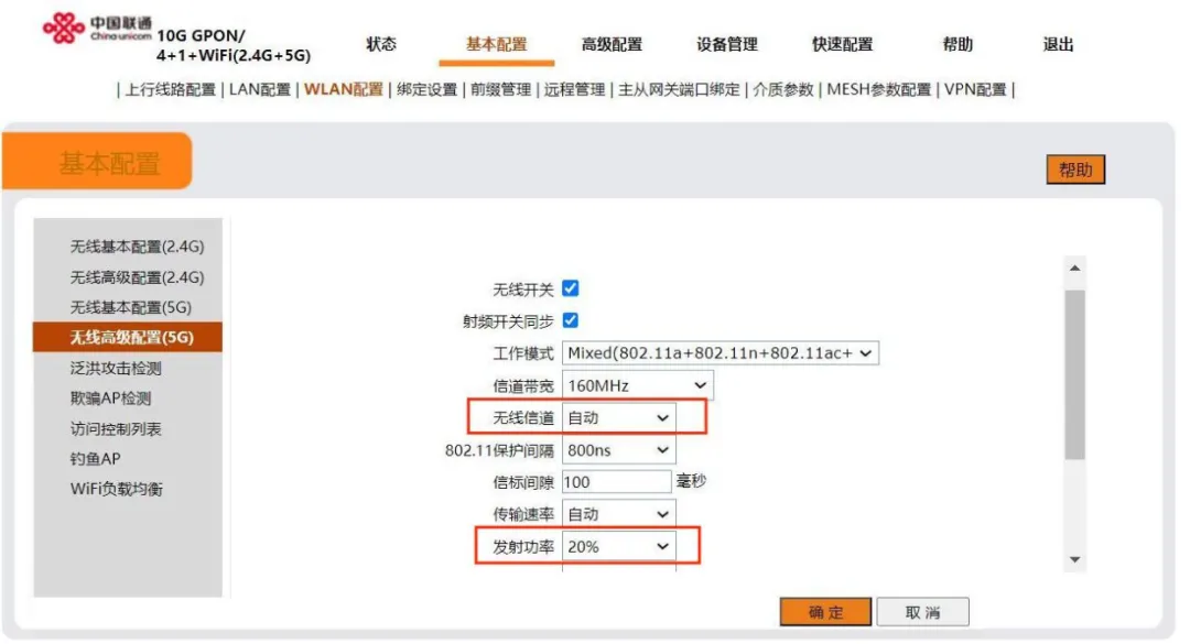 华为主设备信道配置:超级管理员主页 < 基本配置 < WLAN配置 < 2.4G和5G高级配置 < 无线信道调优 < 调节无线发射功率