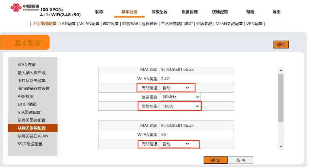 中兴从设备信道配置:超级管理员主页 < 上行线路配置 < 从网关射频配置 < 无线信道调优 < 调节无线发射功率 (多个从设备可根据MAC地址区分)