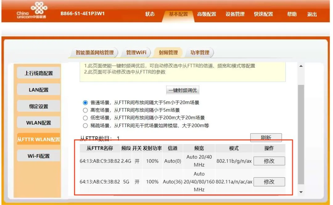 华为从设备信道配置:超级管理员主页 < 基本配置 < 从FTTR WALN配置 < 射频管理 < 修改 < 无线信道调优 < 调节无线发射功率 (多个从设备可根据MAC地址区分)