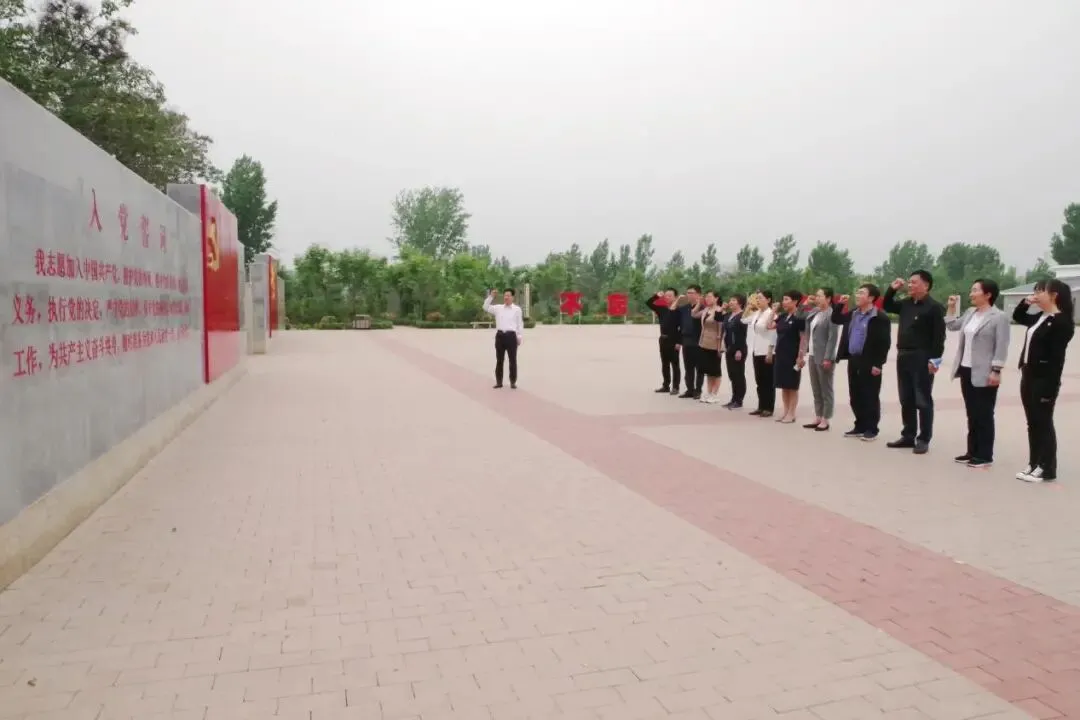 在石林会议旧址门前广场的宣誓墙前,面对鲜艳的党旗,周崇臣院长带领大家庄严举起右手,重温入党誓词,将党员的荣耀、责任和使命牢记在心,铿锵有力的声音在广场上空间久久回荡。