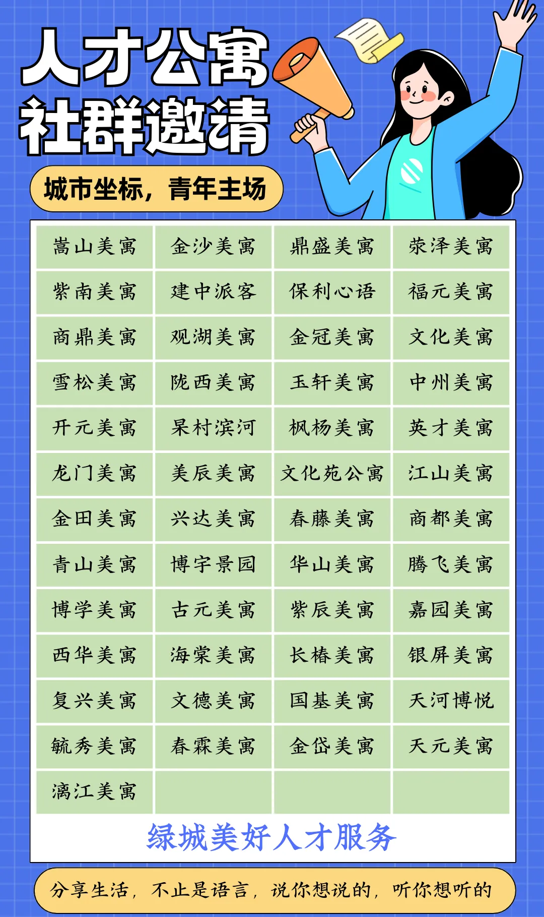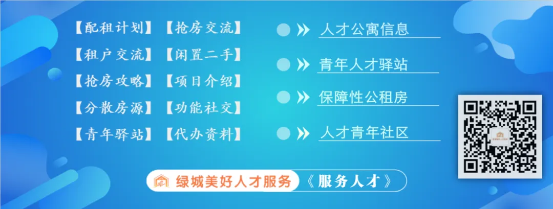 4.绿城美好公众号仅此一个,不存在绿城人才公寓助手等其他公众号,绿城人才公寓所有微信群也不会授权广告商进行商业活动、售卖群聊、插件、代抢等信息,希望各位谨防上当受骗!