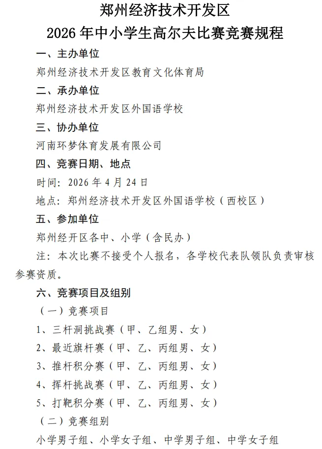 >郑州经开区2026年中小学生高尔夫比赛竞赛规程发布