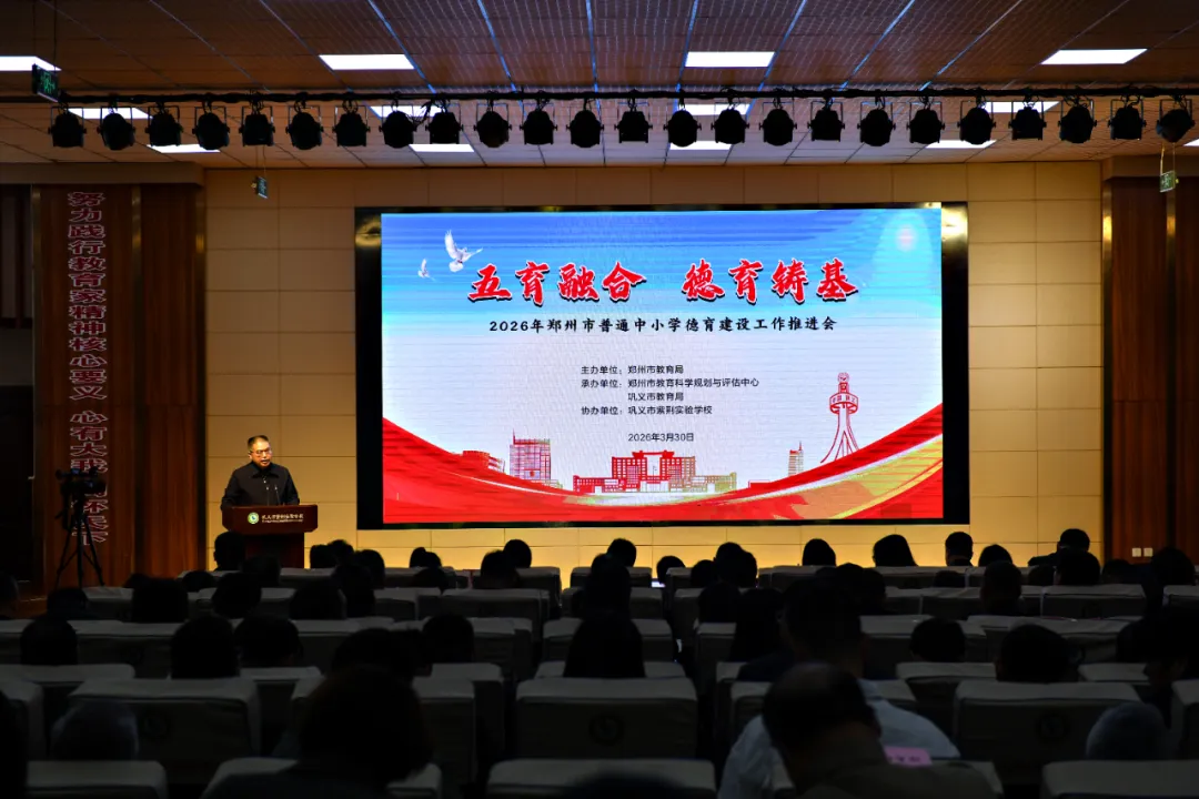 为全面落实立德树人根本任务,推动德育工作提质增效,促进德智体美劳五育相互交融、协同发展,3月30日上午,由郑州市教育局主办,市教育科学规划与评估中心(以下简称“市教评中心”)、巩义市教育局承办的2026年郑州市普通中小学德育建设工作推进会在巩义市紫荆实验学校召开。本次推进会以“五育融合,德育铸基”为主题,旨在传达学习习近平总书记关于教育的重要论述,全面总结2025年德育工作成效,交流分享中小学德育工作的经验做法,安排部署2026年全市中小学德育工作重点任务。