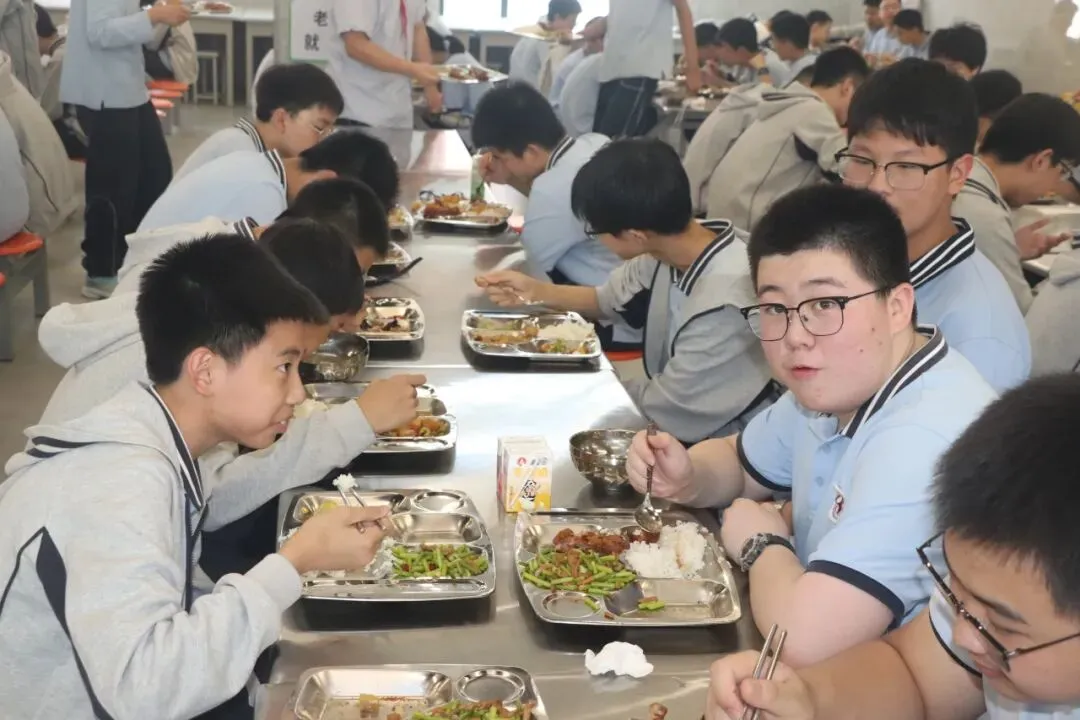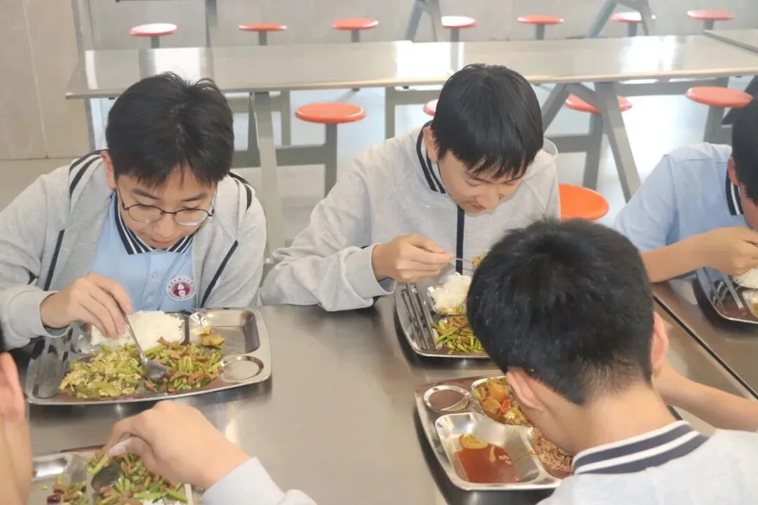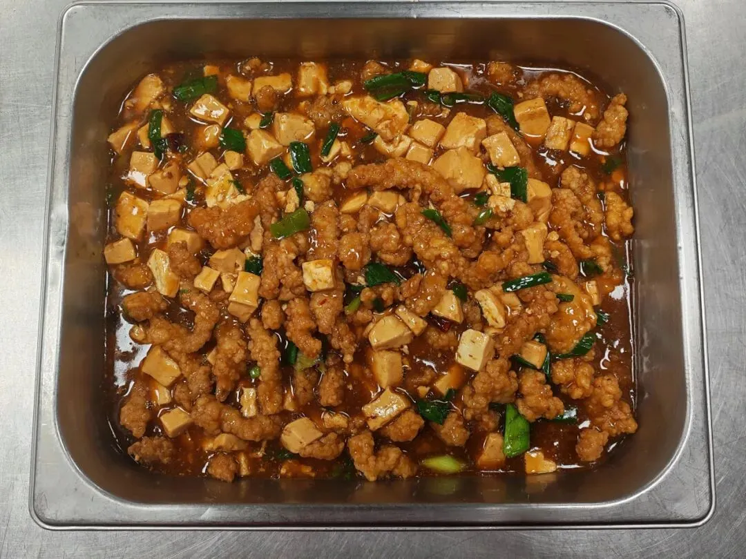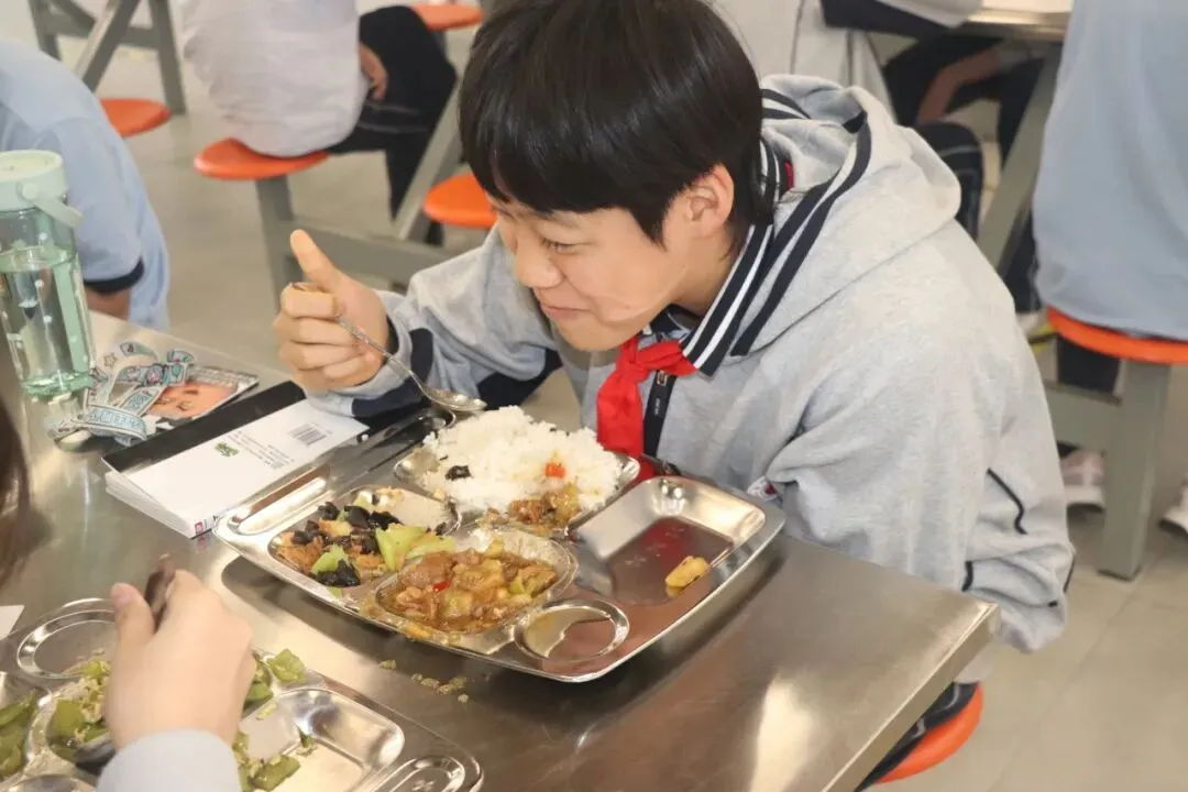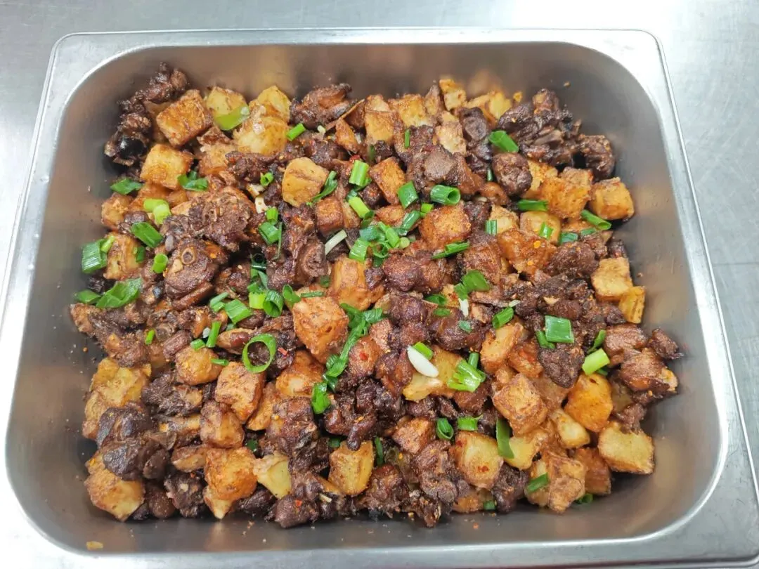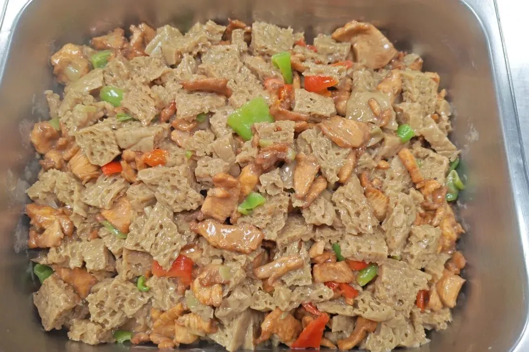 焖子炒肉片(焖子80g肉片80g)、酸辣土豆丝(土豆80g青红椒20g)、酱香饼、馒头